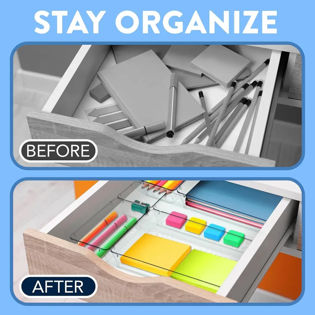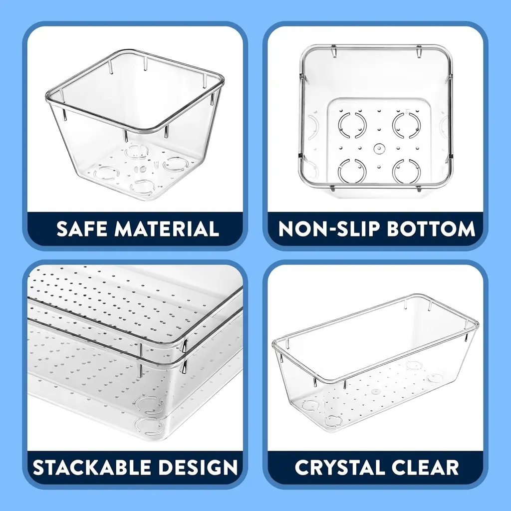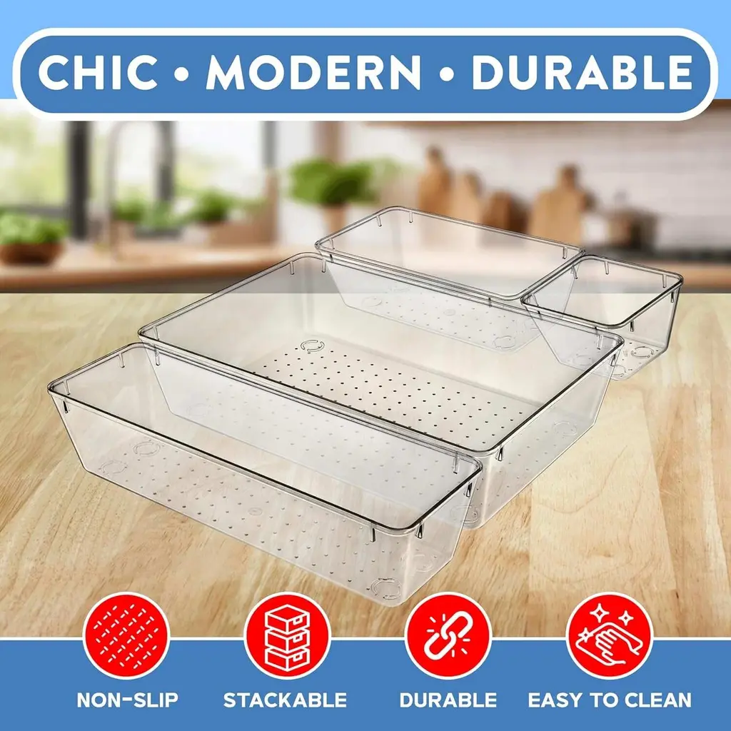 Transform cluttered drawers into neatly organized spaces with the Emporio Kitchen Clear Plastic Drawer Organizers Set. This versatile set is ideal for makeup, bathroom essentials, kitchen gadgets, utensils, office supplies, and more, ensuring everything has its place and is easy to find. The set includes storage bins in four different sizes: These varying sizes allow you to create customized drawer arrangements that fit your specific items perfectly, providing a tailored solution for your organizational needs. Each organizer comes durable silicone pads that provide a non-slip grip, ensuring the bins stay securely in place. Simply stick them on the bottom of the plastic organizers, and your items will remain neatly arranged without shifting or sliding, even when opening and closing drawers. This non-slip design adds an extra layer of stability, making sure your drawers stay tidy and organized. Designed with efficiency in mind, these bins are stackable, helping you maximize storage capacity in any drawer or on countertops. The stackable feature allows for flexible organization, letting you keep your space clutter-free and well-ordered. Whether you’re storing cosmetics in the bathroom, tools in the kitchen, or stationery in the office, these bins adapt to your needs. Crafted from clear plastic, these organizers are not only durable but also easy to clean. A simple wipe-down with a damp cloth is all it takes to maintain their pristine appearance. The clear design also makes it easy to see and access your items quickly, adding both functionality and convenience to your home organization efforts. Elevate your organizational game with the Emporio Kitchen Drawer Organizers Set, and enjoy a tidier, more efficient living space.