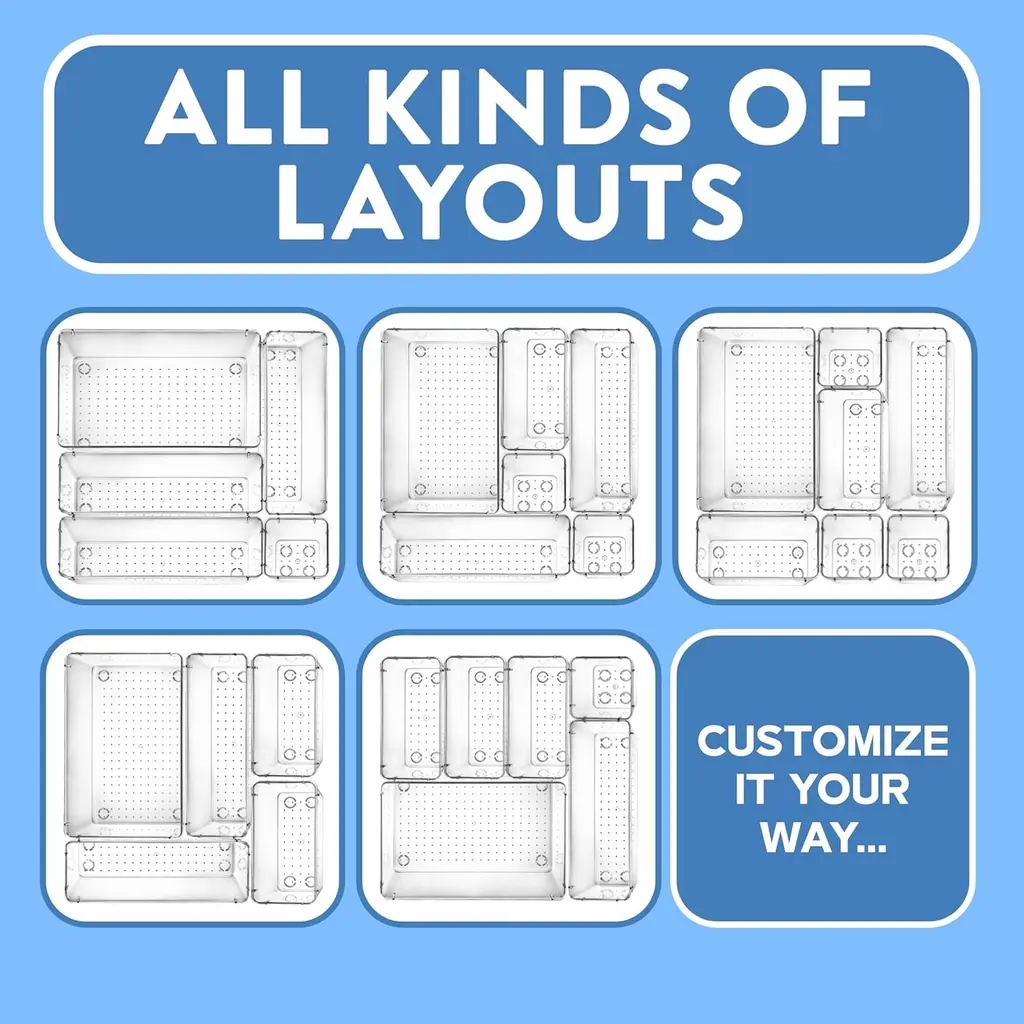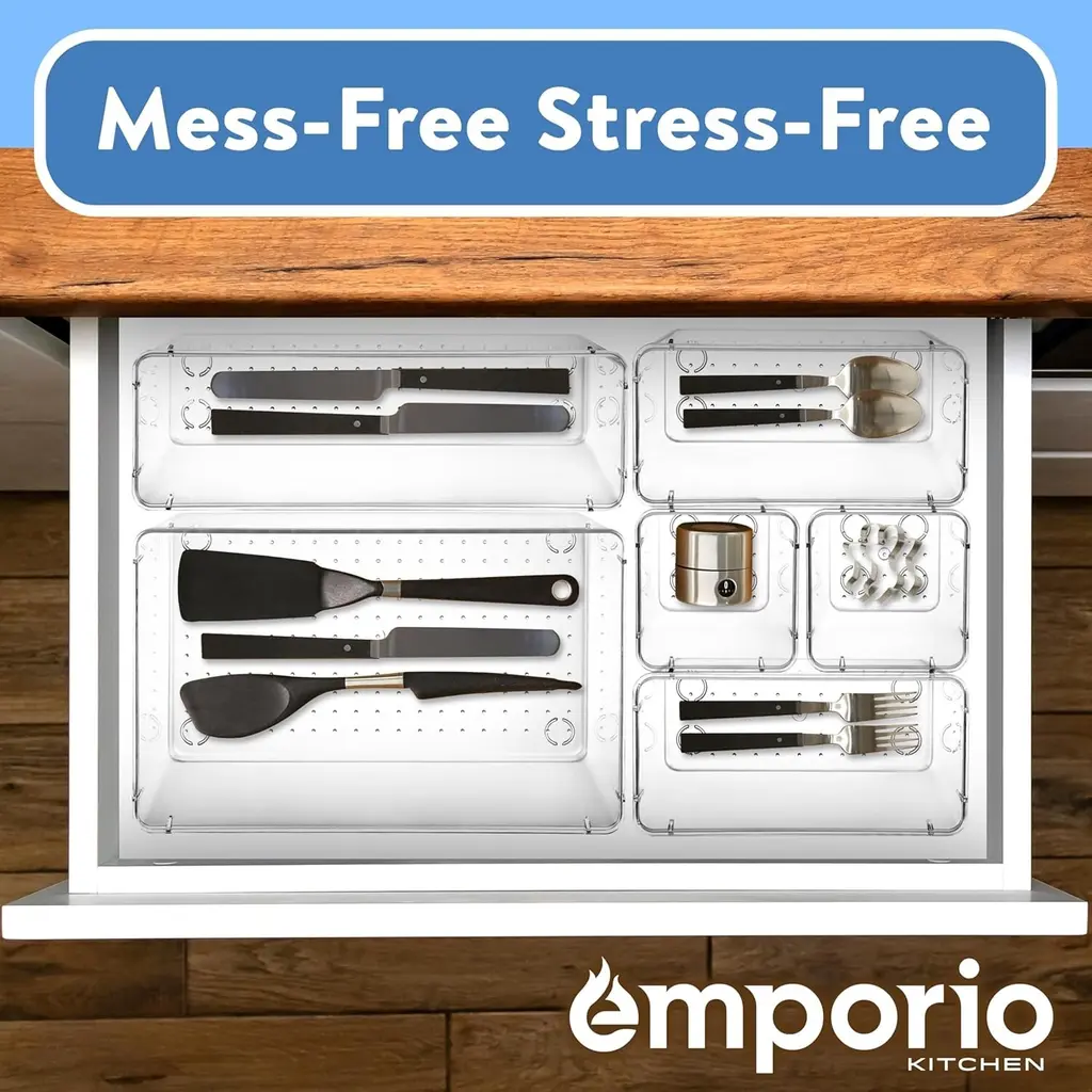 Transform cluttered drawers into neatly organized spaces with the Emporio Kitchen Clear Plastic Drawer Organizers Set. This versatile set is ideal for makeup, bathroom essentials, kitchen gadgets, utensils, office supplies, and more, ensuring everything has its place and is easy to find. The set includes storage bins in four different sizes: These varying sizes allow you to create customized drawer arrangements that fit your specific items perfectly, providing a tailored solution for your organizational needs. Each organizer comes durable silicone pads that provide a non-slip grip, ensuring the bins stay securely in place. Simply stick them on the bottom of the plastic organizers, and your items will remain neatly arranged without shifting or sliding, even when opening and closing drawers. This non-slip design adds an extra layer of stability, making sure your drawers stay tidy and organized. Designed with efficiency in mind, these bins are stackable, helping you maximize storage capacity in any drawer or on countertops. The stackable feature allows for flexible organization, letting you keep your space clutter-free and well-ordered. Whether you’re storing cosmetics in the bathroom, tools in the kitchen, or stationery in the office, these bins adapt to your needs. Crafted from clear plastic, these organizers are not only durable but also easy to clean. A simple wipe-down with a damp cloth is all it takes to maintain their pristine appearance. The clear design also makes it easy to see and access your items quickly, adding both functionality and convenience to your home organization efforts. Elevate your organizational game with the Emporio Kitchen Drawer Organizers Set, and enjoy a tidier, more efficient living space.