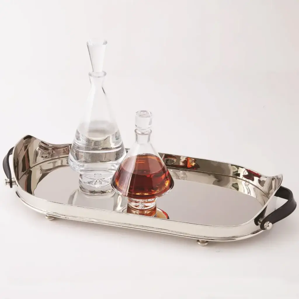 Elegant polished nickel brass tray with leather handles. Perfect for entertaining or displaying collectibles. Note the decanters are sold separately. From a fashion forward perspective, Global Views offers accessories, furniture, statement lighting, and an assortment of rugs and mirrors to add beauty and joy to your home.