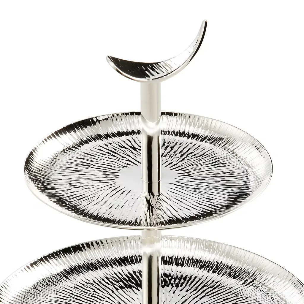 Elevated serving tray exquisitely crafted in a silver-plated alloy.