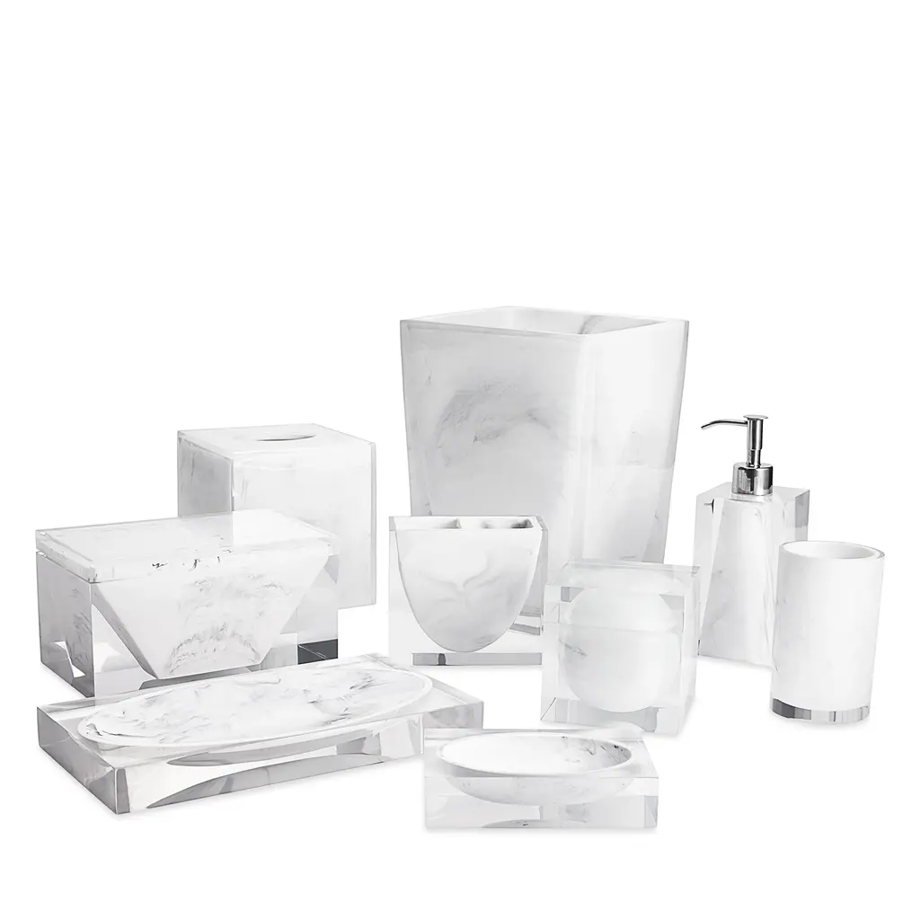 Kassatex's Ducale bath accessories collection simulates the natural patterns of marble with ink-injected resin, resulting in an understated and elegant look that optimally organizes your bathroom essentials.