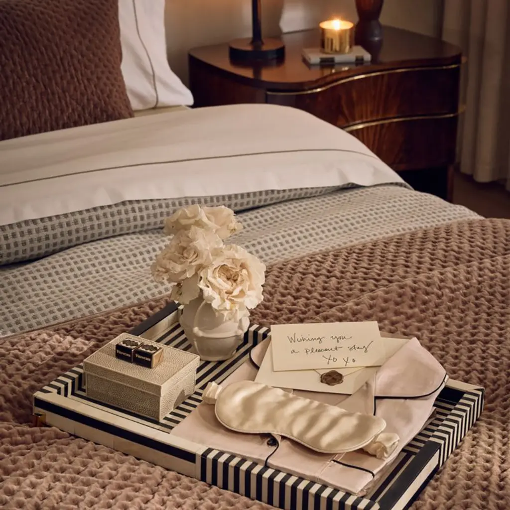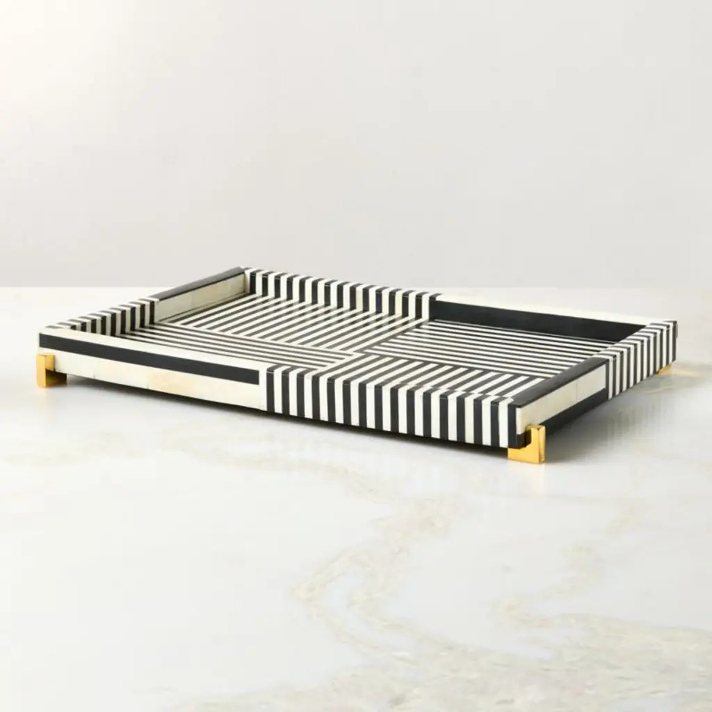 Artisans inlay thin strips of black resin and natural bone to create our best-selling Eadie striped tray with elegantly beveled edges. Each decorative tray is polished for a smooth finish that highlights the subtle variations of the natural material. Cast brass feet are polished for a touch of warmth at the base. Brass is unlacquered, offering a living finish that will develop the patina of a vintage find. Simply polish the brass to bring back its original luster. CB2 exclusive.