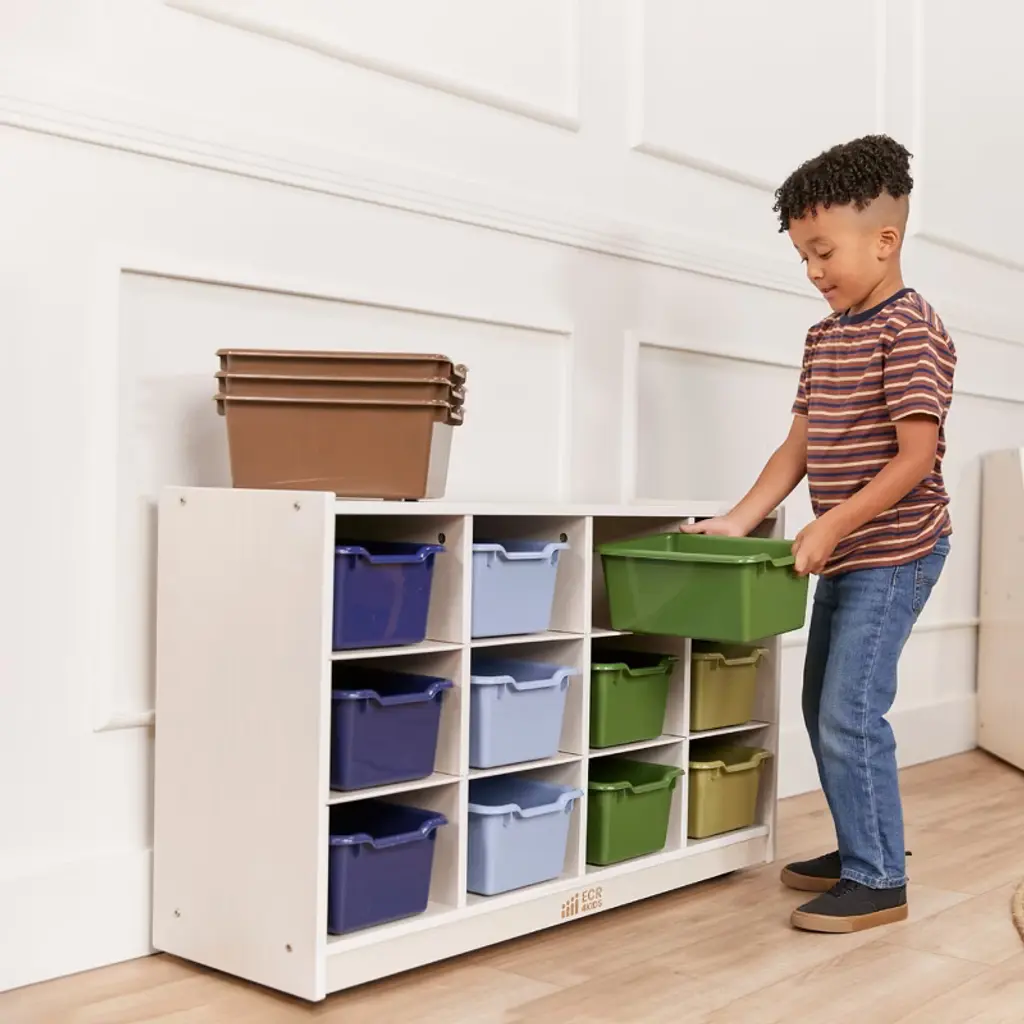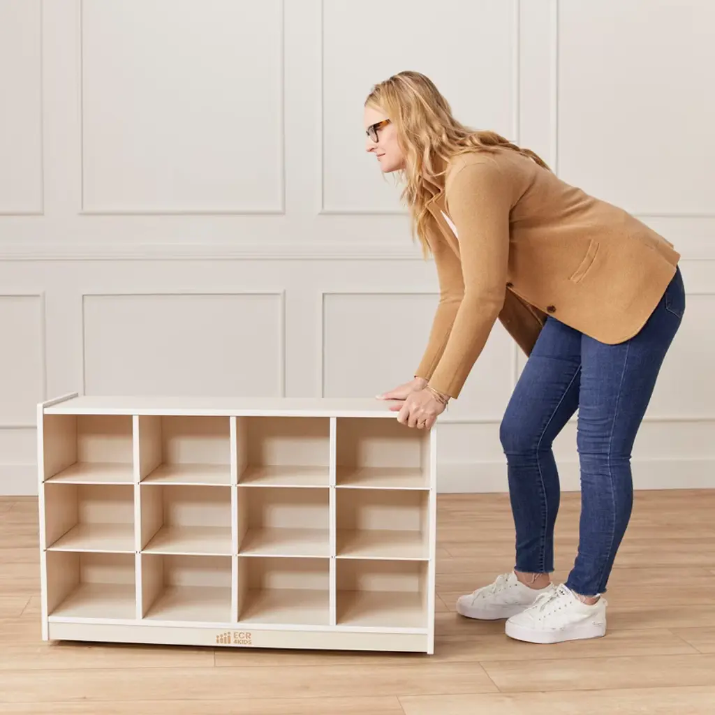 Keep your classroom or playroom uncluttered with the ECR4Kids 12 Cubby Mobile Tray Storage Cabinet with Scoop Front Storage Bins. Ideal for small spaces, kids can organize and store toys, games, building blocks, and school supplies that may otherwise be forgotten. Designed to grow with little ones, this storage cabinet with 15 bins helps parents, teachers, and educators keep small items within reach. Give children their own separate cubby at school to store art projects, homework, and personal belongings. Durable plastic bins feature rounded edges, an easy-to-grasp scoop front handle, and a curved interior to simply remove contents. Lightweight bins are easy to pick up and carry between activities. The low-profile open-face shelves encourage little ones to select their favorite activity independently, introduce organizational skills, and clean up when playtime is over. Four casters are included for mobility; move the storage unit from a hallway to the art room. Constructed from sustainably harvested birch plywood with a durable finish sealing the wood surface and resisting scratching. A UV inhibitor helps furniture resist ultraviolet light and yellowing. Birch plywood is extremely durable and will hold up to everyday use in an early childhood environment.