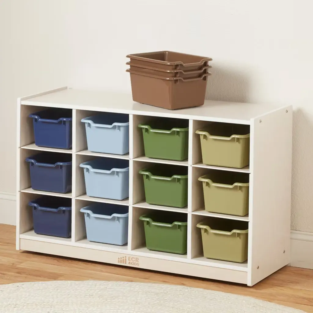 Ecr4kids 12 Cubby Mobile Tray Cabinet With 15 Scoop Front Storage Bins, 3X4, White Wash, Earthtone