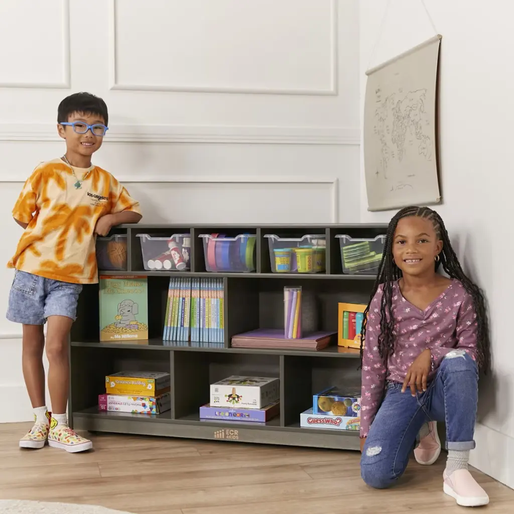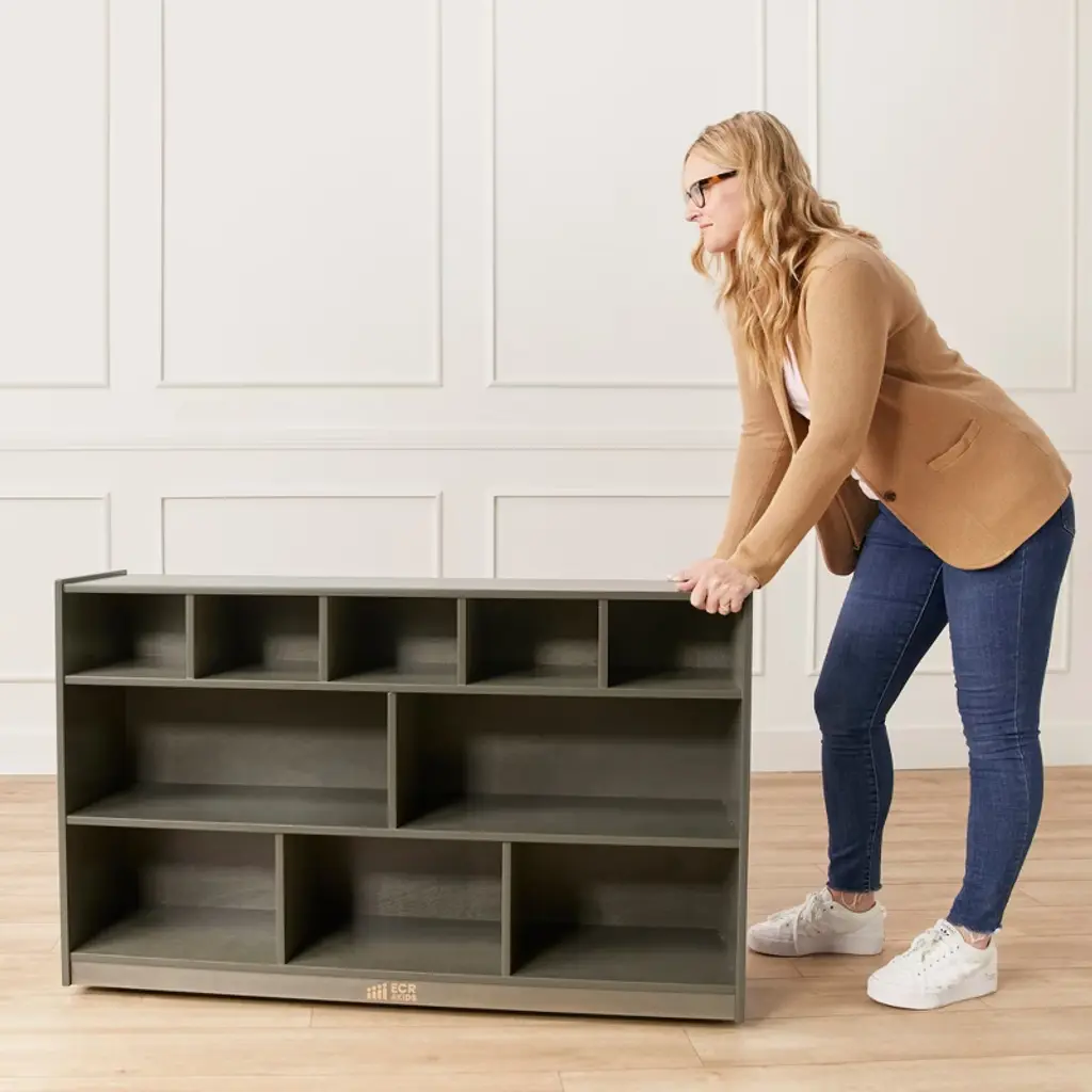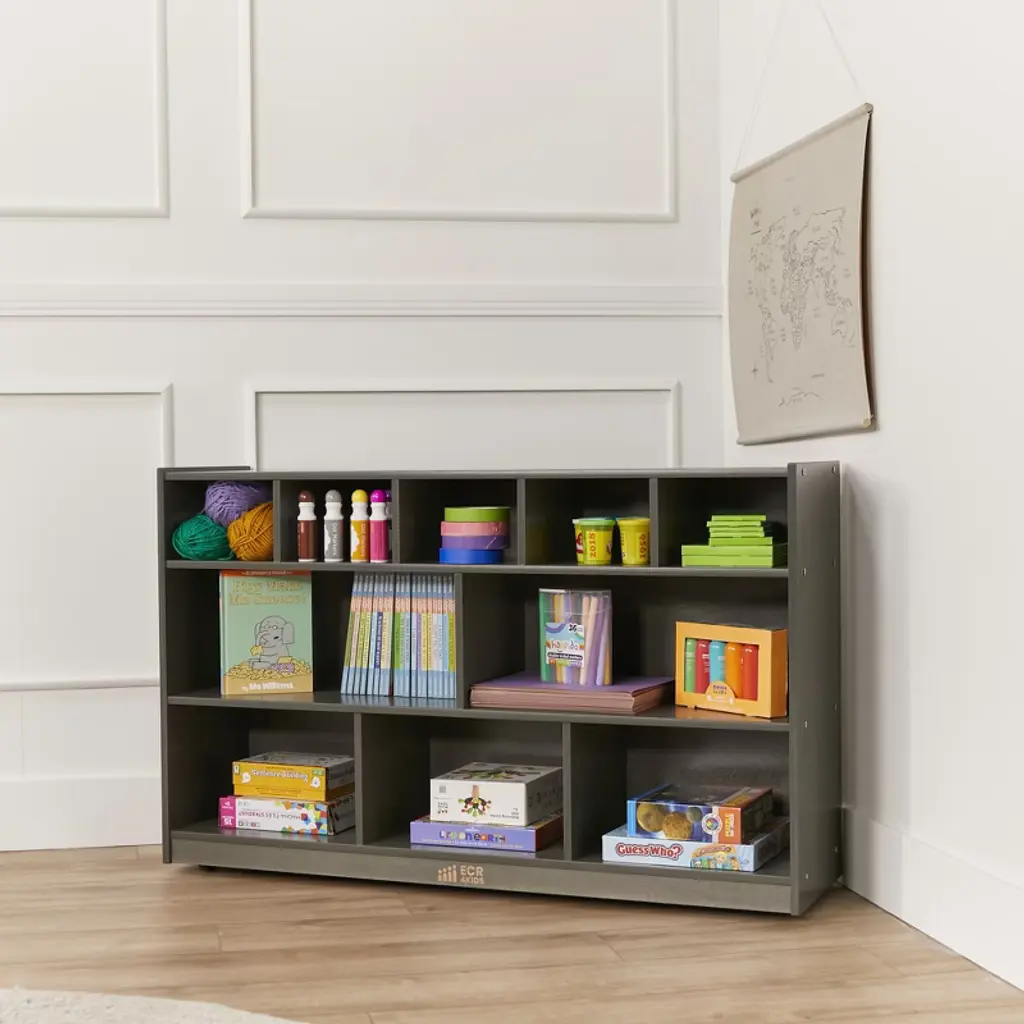 Organize your daycare, preschool, or home with ECR4Kids 5+5 Mobile Storage and Tray Cabinet. The multipurpose storage solution features five compartments and five cubbies to display and store books, games, toys, and more. Designed to grow with little ones, this tray storage cabinet helps parents, teachers, and educators keep small items off the floor and within reach. Make playtime more manageable with displays of developmentally appropriate toys; rearrange play spaces with too many options. Use this toy rotation storage to bring excitement back as playthings are refreshed. Pair with ECR4Kids Scoop Front Storage Bins for a complete storage solution; bins are sold separately. The low-profile open-face shelves encourage little ones to select their favorite activity independently, introduce organizational skills, and clean up when playtime is over. Four casters are included for mobility making the transition between classrooms easy. Constructed from sustainably harvested birch plywood with a durable finish sealing the wood surface and resisting scratching. A UV inhibitor helps furniture resist ultraviolet light and yellowing. Birch plywood is extremely durable and will hold up to everyday use in an early childhood environment.
