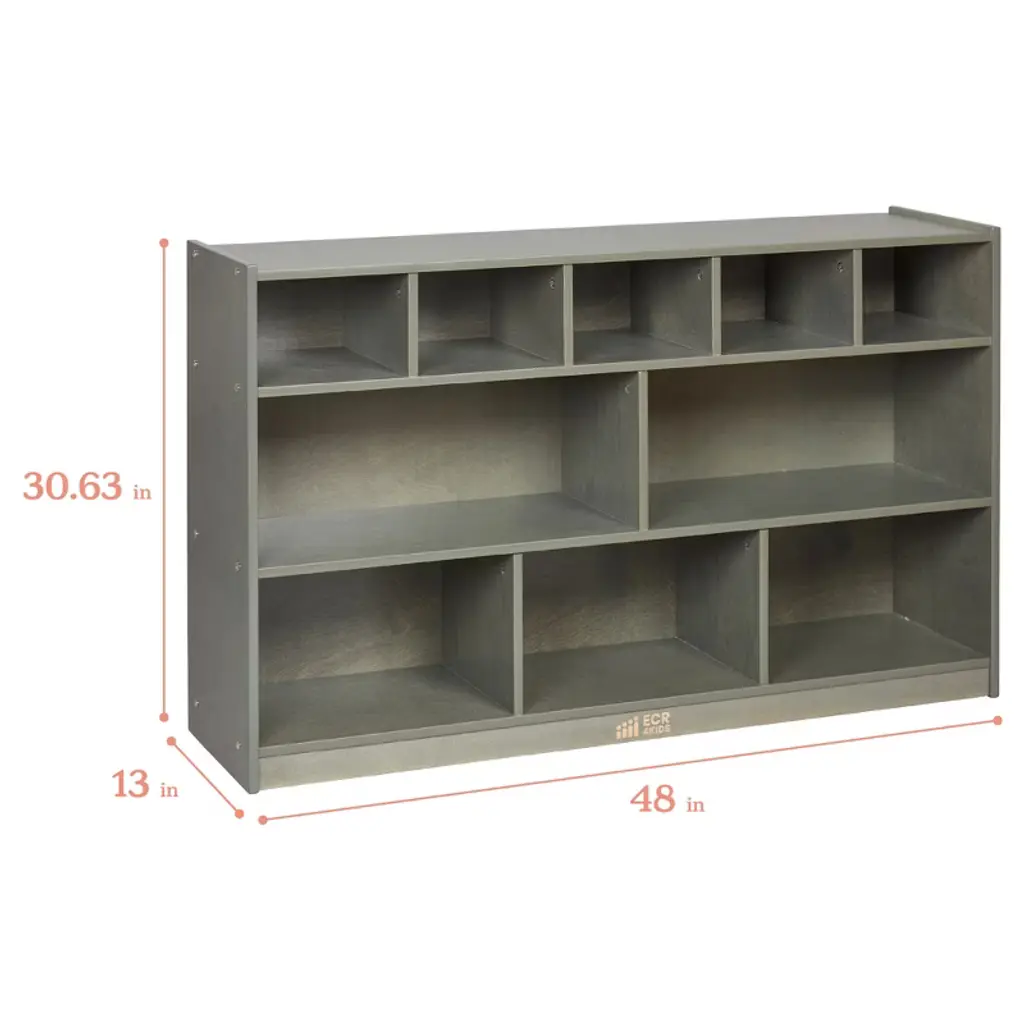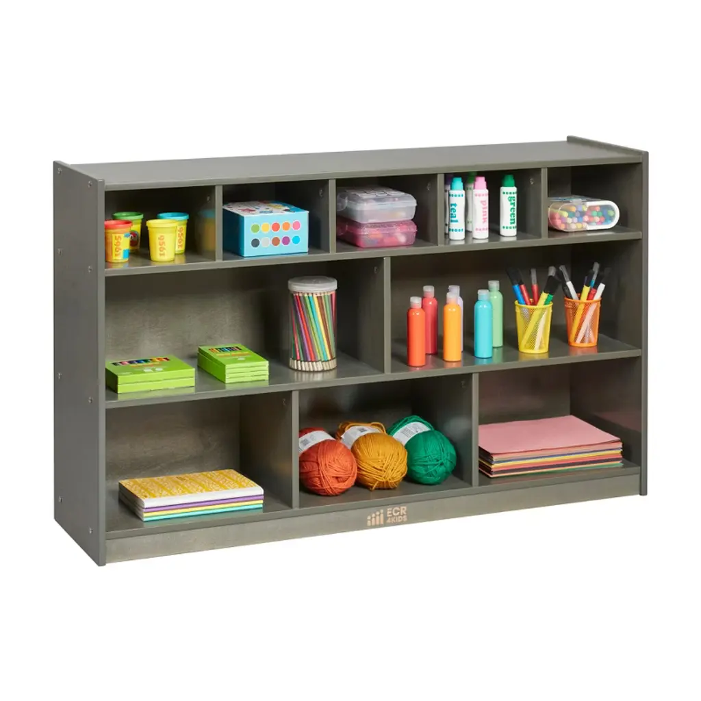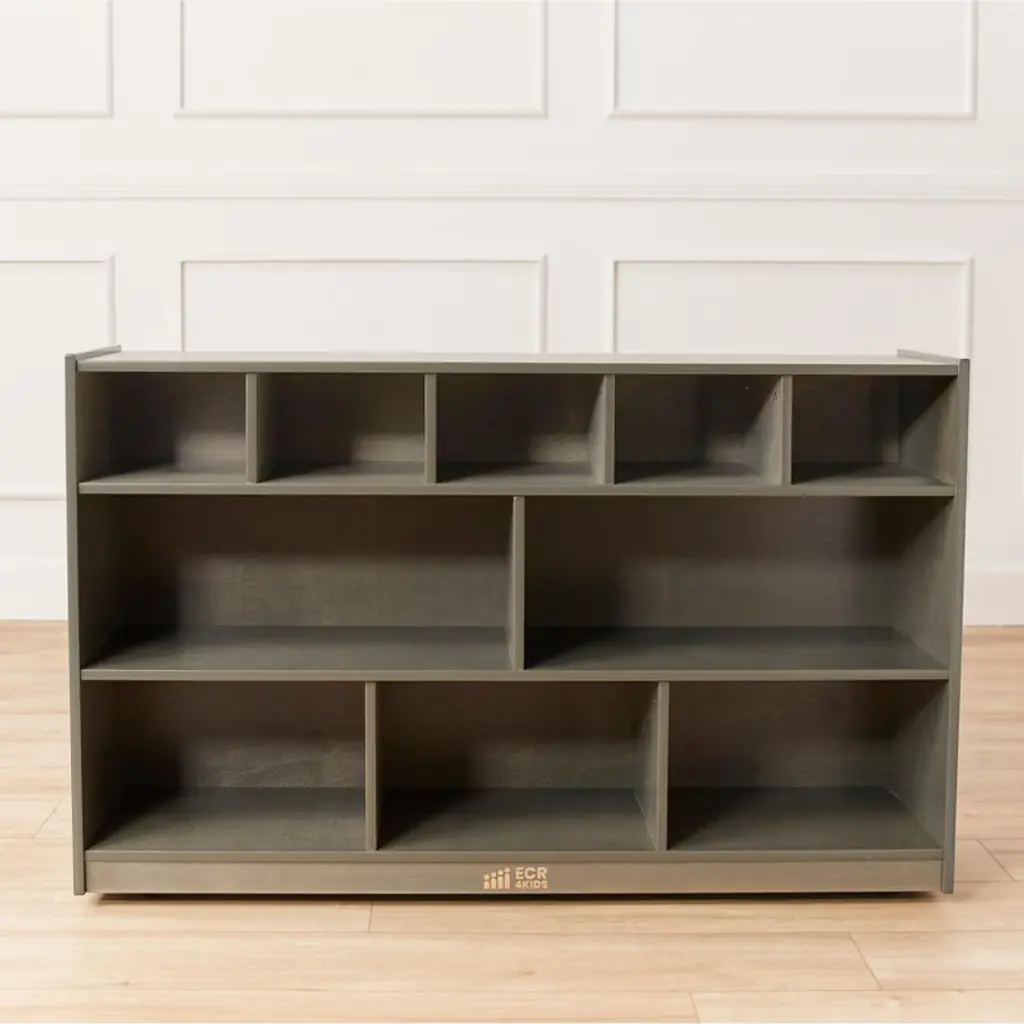 Organize your daycare, preschool, or home with ECR4Kids 5+5 Mobile Storage and Tray Cabinet. The multipurpose storage solution features five compartments and five cubbies to display and store books, games, toys, and more. Designed to grow with little ones, this tray storage cabinet helps parents, teachers, and educators keep small items off the floor and within reach. Make playtime more manageable with displays of developmentally appropriate toys; rearrange play spaces with too many options. Use this toy rotation storage to bring excitement back as playthings are refreshed. Pair with ECR4Kids Scoop Front Storage Bins for a complete storage solution; bins are sold separately. The low-profile open-face shelves encourage little ones to select their favorite activity independently, introduce organizational skills, and clean up when playtime is over. Four casters are included for mobility making the transition between classrooms easy. Constructed from sustainably harvested birch plywood with a durable finish sealing the wood surface and resisting scratching. A UV inhibitor helps furniture resist ultraviolet light and yellowing. Birch plywood is extremely durable and will hold up to everyday use in an early childhood environment.