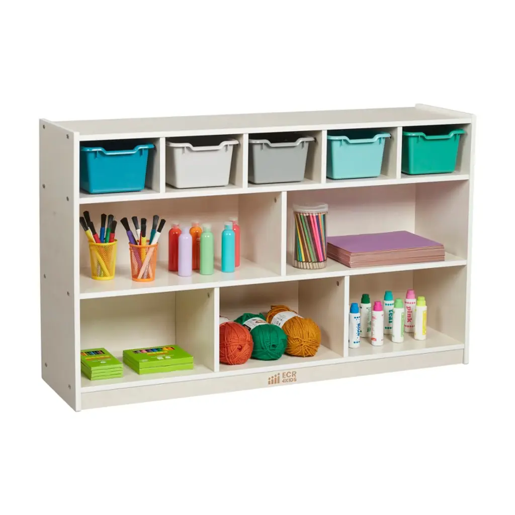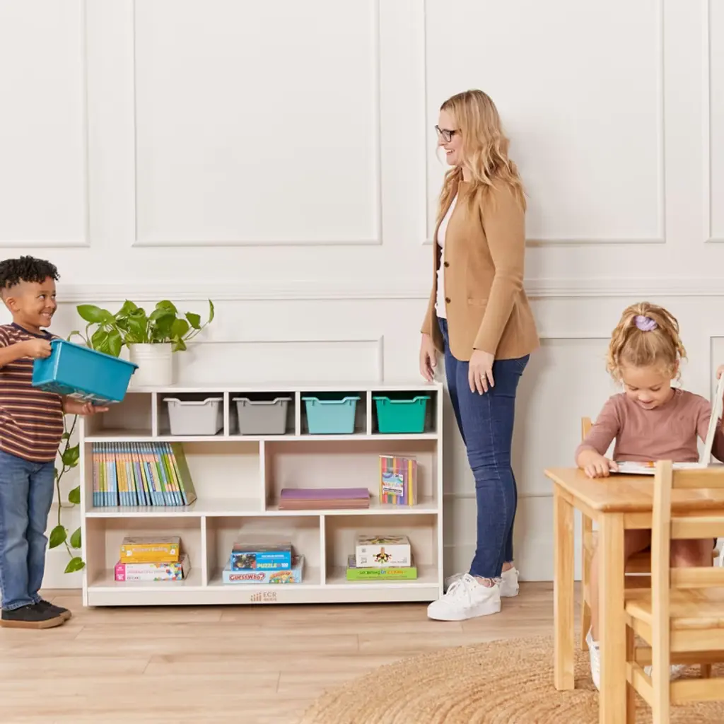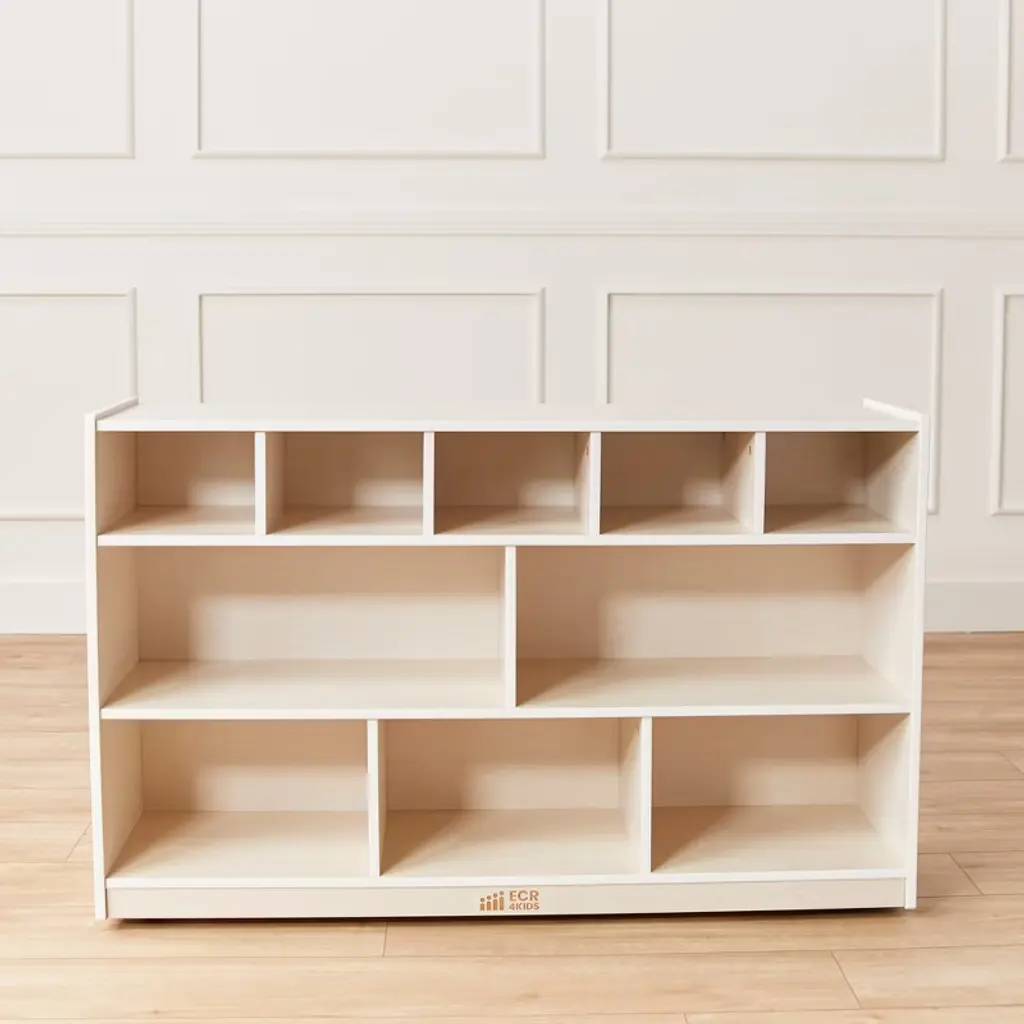 Organize your daycare, preschool, or home with ECR4Kids 5+5 Mobile Storage and Tray Cabinet with Scoop Front Storage Bins. The multipurpose storage solution features five compartments and five cubbies to display and store books, games, and toys. Designed to grow with little ones, this tray storage cabinet helps parents, teachers, and educators keep small items off the floor and within reach. Make playtime more manageable with displays of developmentally appropriate toys; rearrange play spaces with too many options. Use this toy rotation storage to bring excitement back as playthings are refreshed. Durable plastic bins feature rounded edges, an easy-to-grasp scoop front handle, and a curved interior to simply remove contents. Lightweight bins are easy to pick up and carry between activities. The low-profile open-face shelves encourage little ones to select their favorite activity independently and introduce organizational skills and clean up when playtime is over. Four casters are included for mobility; move the storage unit from a hallway to the art room. Constructed from sustainably harvested birch plywood with a durable finish sealing the wood surface and resisting scratching. A UV inhibitor helps furniture resist ultraviolet light and yellowing. A UV inhibitor makes furniture resistant to ultraviolet light and yellowing.