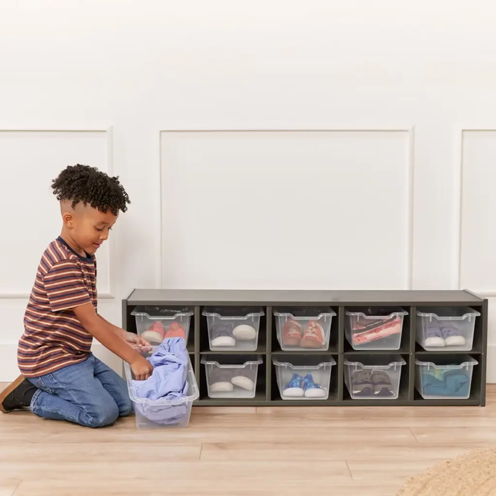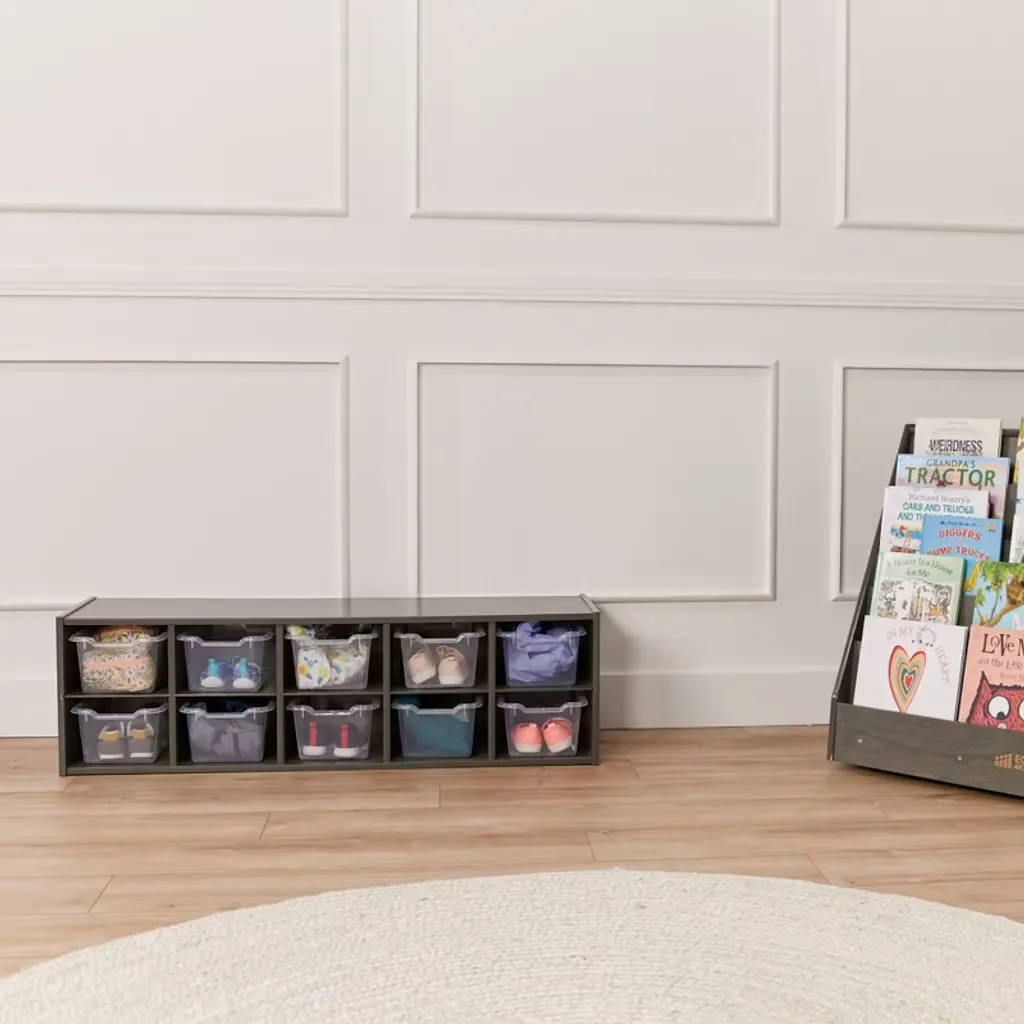 Ecr4kids Streamline 10 Cubby Tray Cabinet With 10 Scoop Front Storage Bins, 2X5, Grey Wash, Clear