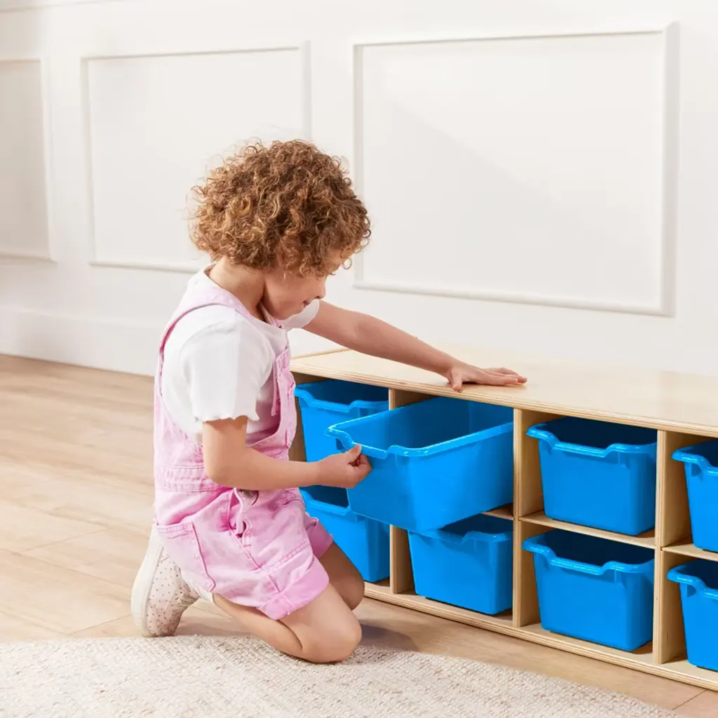 Keep your classroom uncluttered with the ECR4Kids Streamline 10 Cubby Tray Cabinet with Scoop Front Storage Bins. Ideal for small spaces, kids can organize and store toys, games, building blocks, and school supplies that may otherwise be forgotten. Designed to grow with little ones, this storage cabinet with bins helps parents, teachers, and educators keep small items within reach. Give children their own separate cubby at school to store art projects, homework, and personal belongings. Durable plastic bins feature rounded edges, an easy-to-grasp scoop front handle, and a curved interior to simply remove contents. Lightweight bins are easy to pick up and carry between activities. The low-profile open-face shelves encourage children to select their favorite activity independently and introduce organizational skills and clean up when playtime is over. Constructed from sustainably harvested birch plywood with a durable finish sealing the wood surface and resisting scratching. A UV inhibitor helps furniture resist ultraviolet light and yellowing. Natural birch plywood is extremely durable and will hold up to everyday use in an early childhood environment. Combine the Montessori storage with other ECR4Kids Birch Collection furniture pieces to complete the space.