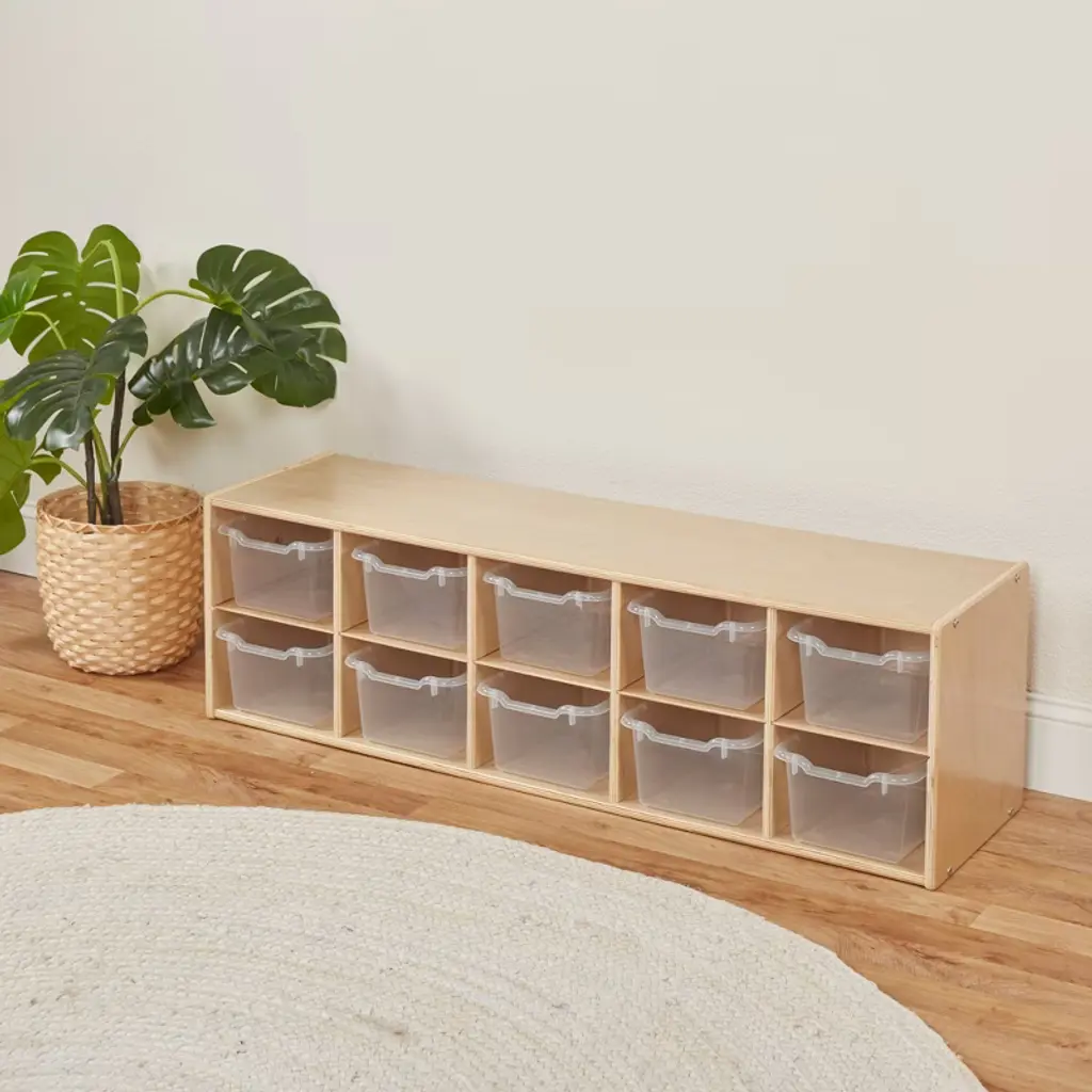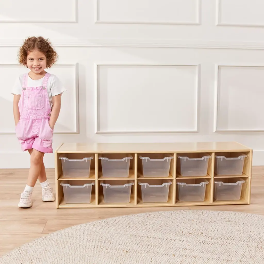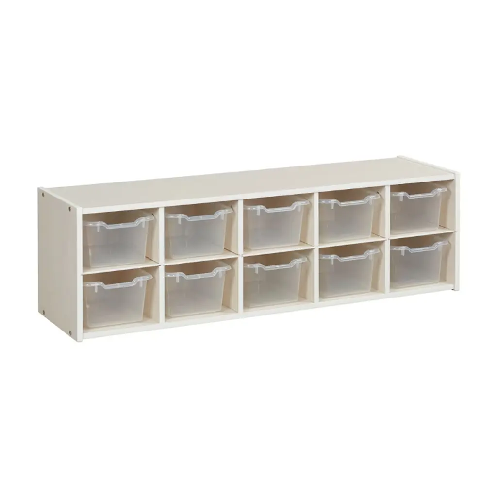 Ecr4kids Streamline 10 Cubby Tray Cabinet With 10 Scoop Front Storage Bins, 2X5, Natural, Clear