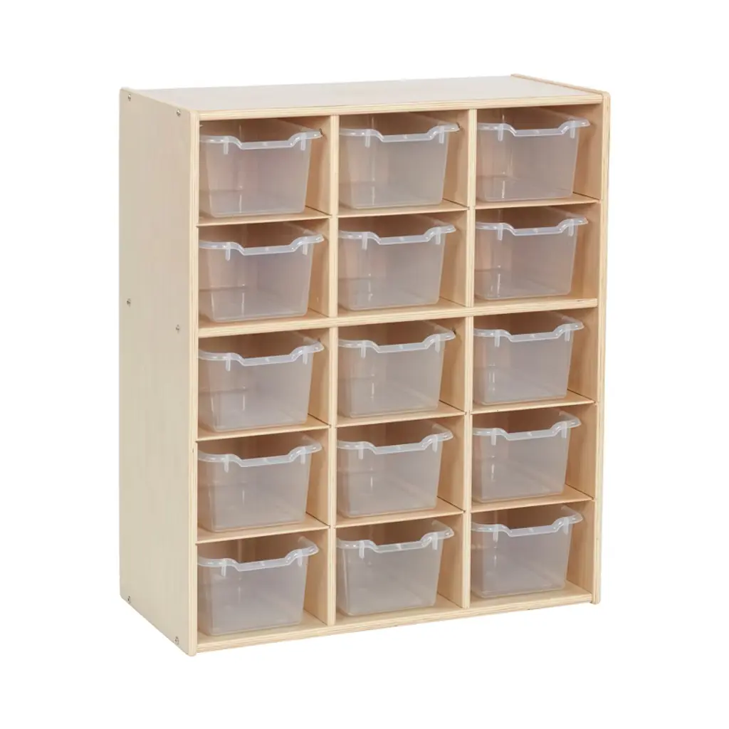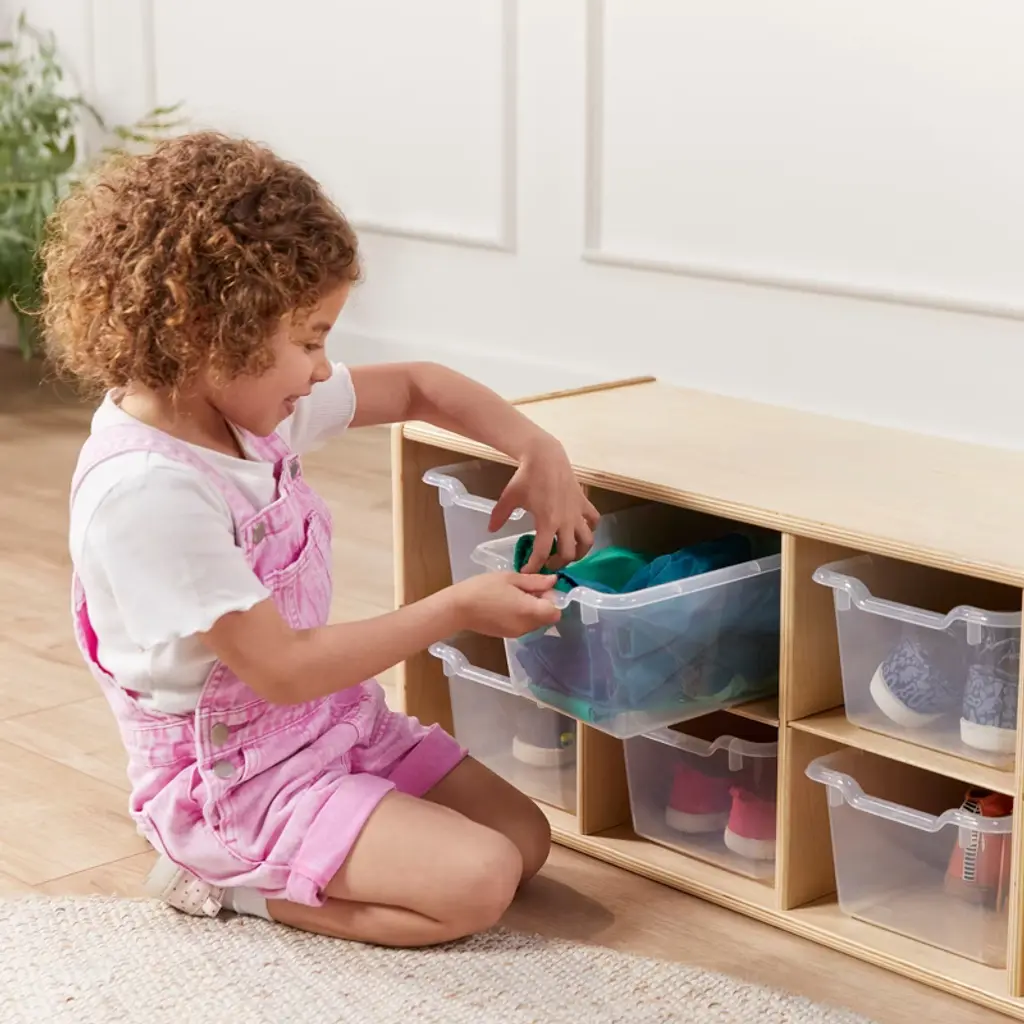 Keep your classroom uncluttered with the ECR4Kids Streamline 10 Cubby Tray Cabinet with Scoop Front Storage Bins. Ideal for small spaces, kids can organize and store toys, games, building blocks, and school supplies that may otherwise be forgotten. Designed to grow with little ones, this storage cabinet with bins helps parents, teachers, and educators keep small items within reach. Give children their own separate cubby at school to store art projects, homework, and personal belongings. Durable plastic bins feature rounded edges, an easy-to-grasp scoop front handle, and a curved interior to simply remove contents. Lightweight bins are easy to pick up and carry between activities. The low-profile open-face shelves encourage children to select their favorite activity independently and introduce organizational skills and clean up when playtime is over. Constructed from sustainably harvested birch plywood with a durable finish sealing the wood surface and resisting scratching. A UV inhibitor helps furniture resist ultraviolet light and yellowing. Natural birch plywood is extremely durable and will hold up to everyday use in an early childhood environment. Combine the Montessori storage with other ECR4Kids Birch Collection furniture pieces to complete the space.
