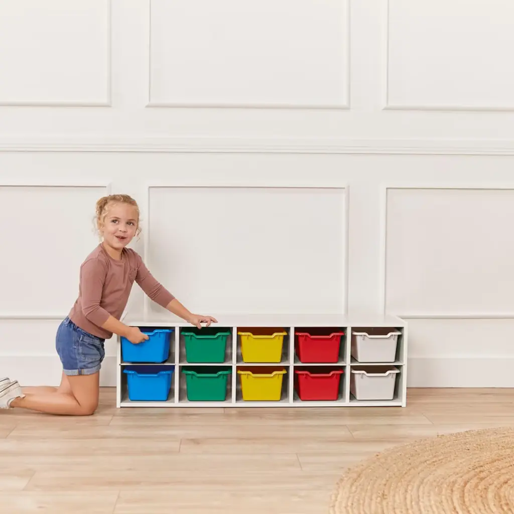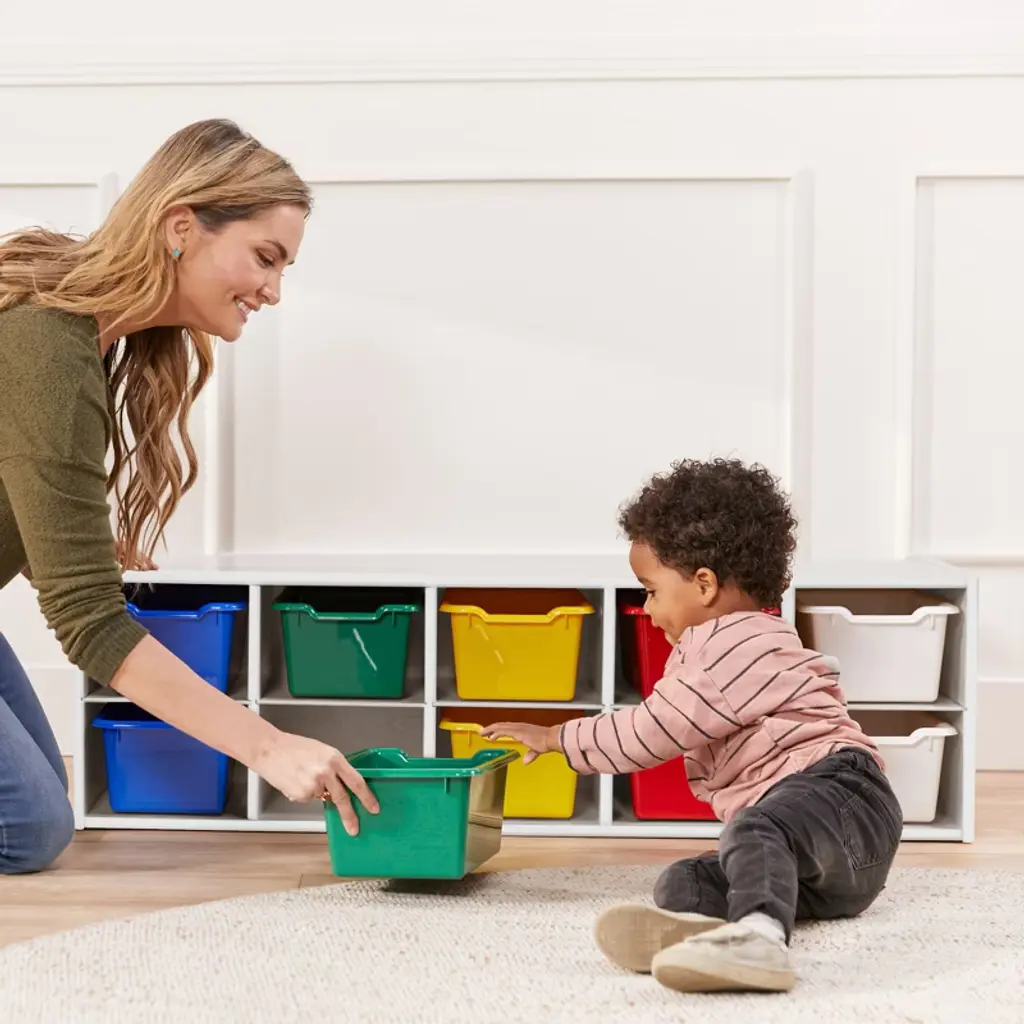 Keep your classroom uncluttered with the ECR4Kids Streamline 10 Cubby Tray Cabinet with Scoop Front Storage Bins. Ideal for small spaces, kids can organize and store toys, games, building blocks, and school supplies that may otherwise be forgotten. Designed to grow with little ones, this storage cabinet with bins helps parents, teachers, and educators keep small items within reach. Give children their own separate cubby at school to store art projects, homework, and personal belongings. Durable plastic bins feature rounded edges, an easy-to-grasp scoop front handle, and a curved interior to simply remove contents. Lightweight bins are easy to pick up and carry between activities. The low-profile open-face shelves encourage children to select their favorite activity independently and introduce organizational skills and clean up when playtime is over. Constructed from sustainably harvested birch plywood with a durable finish sealing the wood surface and resisting scratching. A UV inhibitor helps furniture resist ultraviolet light and yellowing. Natural birch plywood is extremely durable and will hold up to everyday use in an early childhood environment. Combine the Montessori storage with other ECR4Kids Birch Collection furniture pieces to complete the space.