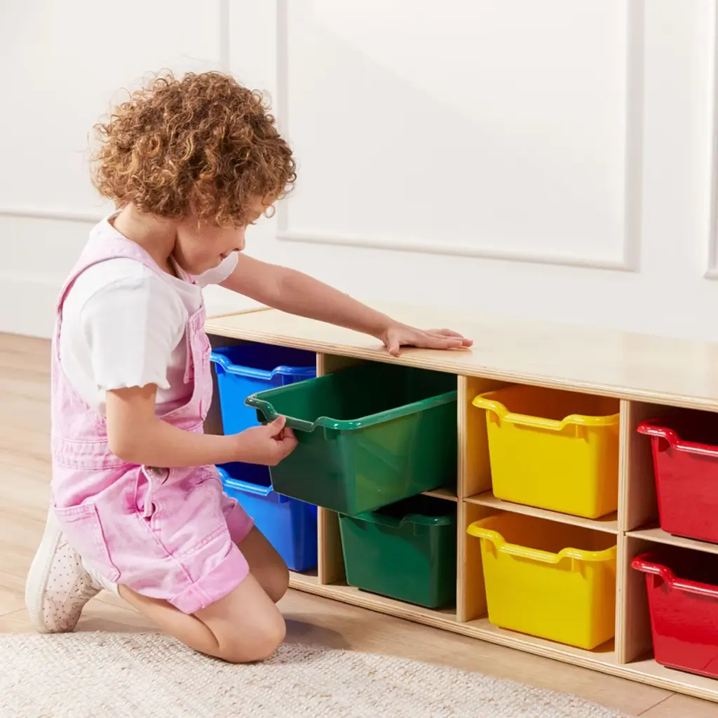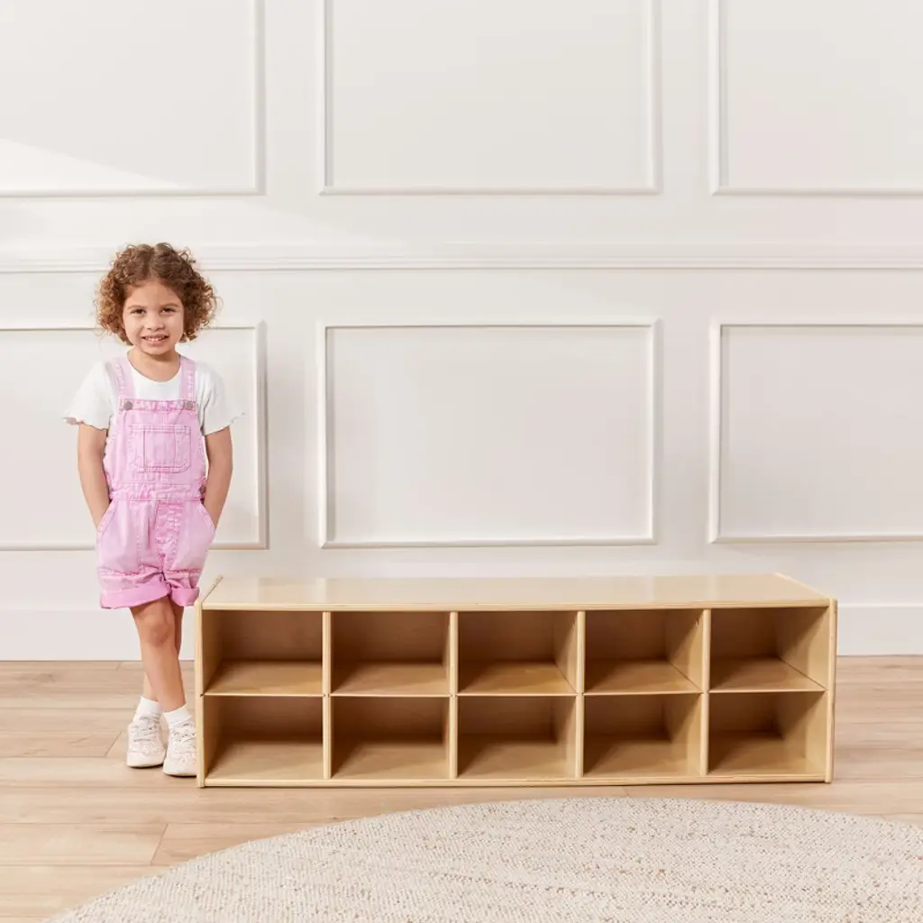 Keep your early childhood environment uncluttered with the ECR4Kids Streamline 10 Cubby Tray Storage Cabinet. Ideal for small spaces, kids and adults can organize and store toys, games, building blocks, and school supplies that may otherwise be forgotten. Designed to grow with little ones, this storage cabinet helps parents, teachers, and educators sort and store small items and keep them within reach. Give children their own separate cubby at school to store art projects, individual items, homework, and more. Pair with ECR4Kids Scoop Front Storage Bins to keep little things contained and off the floor; bins are sold separately. The low-profile open-face shelves encourage children to select their favorite activity independently and confidently and clean up when playtime is over. Introducing organizational skills at a young age helps kids handle information in a logical way, prioritizing activities and building self-esteem. Constructed from sustainably harvested birch plywood with a durable finish sealing the wood surface and resisting scratching. A UV inhibitor helps furniture resist ultraviolet light and yellowing. Natural birch plywood is extremely durable and will hold up to everyday use in a classroom, homeschool, or library.
