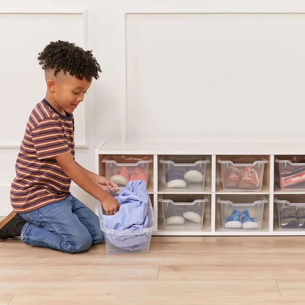 Keep your early childhood environment uncluttered with the ECR4Kids Streamline 10 Cubby Tray Storage Cabinet. Ideal for small spaces, kids and adults can organize and store toys, games, building blocks, and school supplies that may otherwise be forgotten. Designed to grow with little ones, this storage cabinet helps parents, teachers, and educators sort and store small items and keep them within reach. Give children their own separate cubby at school to store art projects, individual items, homework, and more. Pair with ECR4Kids Scoop Front Storage Bins to keep little things contained and off the floor; bins are sold separately. The low-profile open-face shelves encourage children to select their favorite activity independently and confidently and clean up when playtime is over. Introducing organizational skills at a young age helps kids handle information in a logical way, prioritizing activities and building self-esteem. Constructed from sustainably harvested birch plywood with a durable finish sealing the wood surface and resisting scratching. A UV inhibitor helps furniture resist ultraviolet light and yellowing. Natural birch plywood is extremely durable and will hold up to everyday use in a classroom, homeschool, or library.