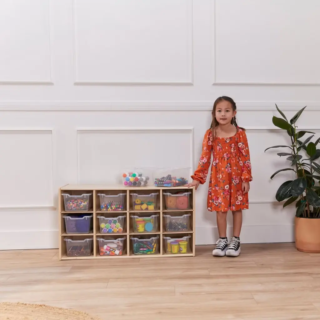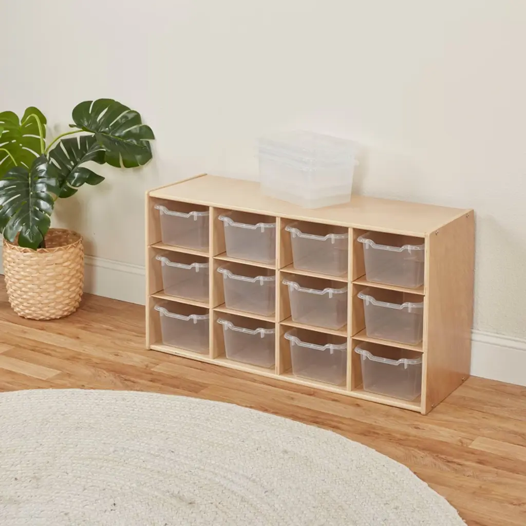 Ecr4kids Streamline 12 Cubby Tray Cabinet With 15 Scoop Front Storage Bins, 3X4, Natural, Clear