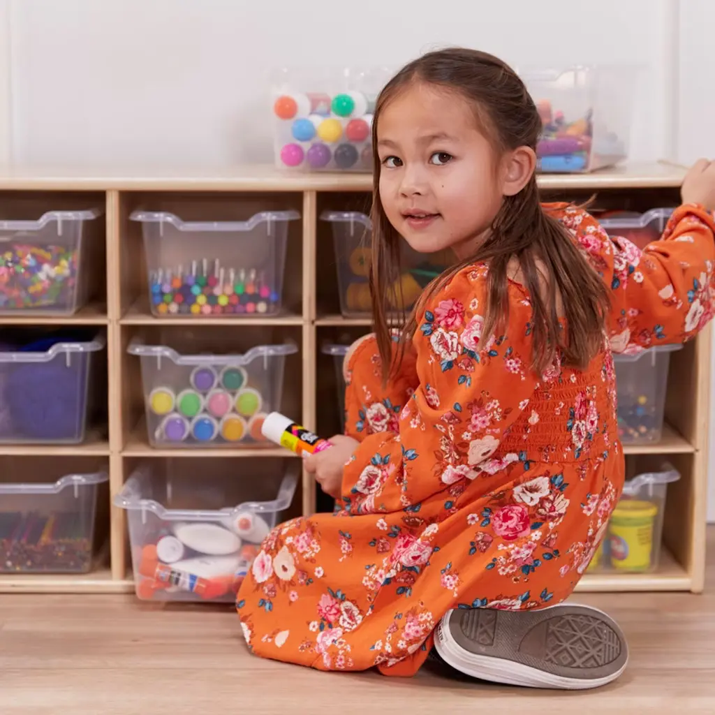 Keep your classroom uncluttered with the ECR4Kids Streamline 12 Cubby Tray Cabinet with Scoop Front Storage Bins. Ideal for small spaces, kids can organize and store toys, games, building blocks, and school supplies that may otherwise be forgotten. Designed to grow with little ones, this storage cabinet with bins helps parents, teachers, and educators keep small items within reach. Give children their own separate cubby at school to store art projects, homework, and personal belongings. Durable plastic bins feature rounded edges, an easy-to-grasp scoop front handle, and a curved interior to simply remove contents. Lightweight bins are easy to pick up and carry between activities. The low-profile open-face shelves encourage children to select their favorite activity independently and introduce organizational skills and clean up when playtime is over. Constructed from sustainably harvested birch plywood with a durable finish sealing the wood surface and resisting scratching. A UV inhibitor helps furniture resist ultraviolet light and yellowing. Natural birch plywood is extremely durable and will hold up to everyday use in an early childhood environment. Combine the Montessori storage with other ECR4Kids Birch Collection furniture pieces to complete the space.