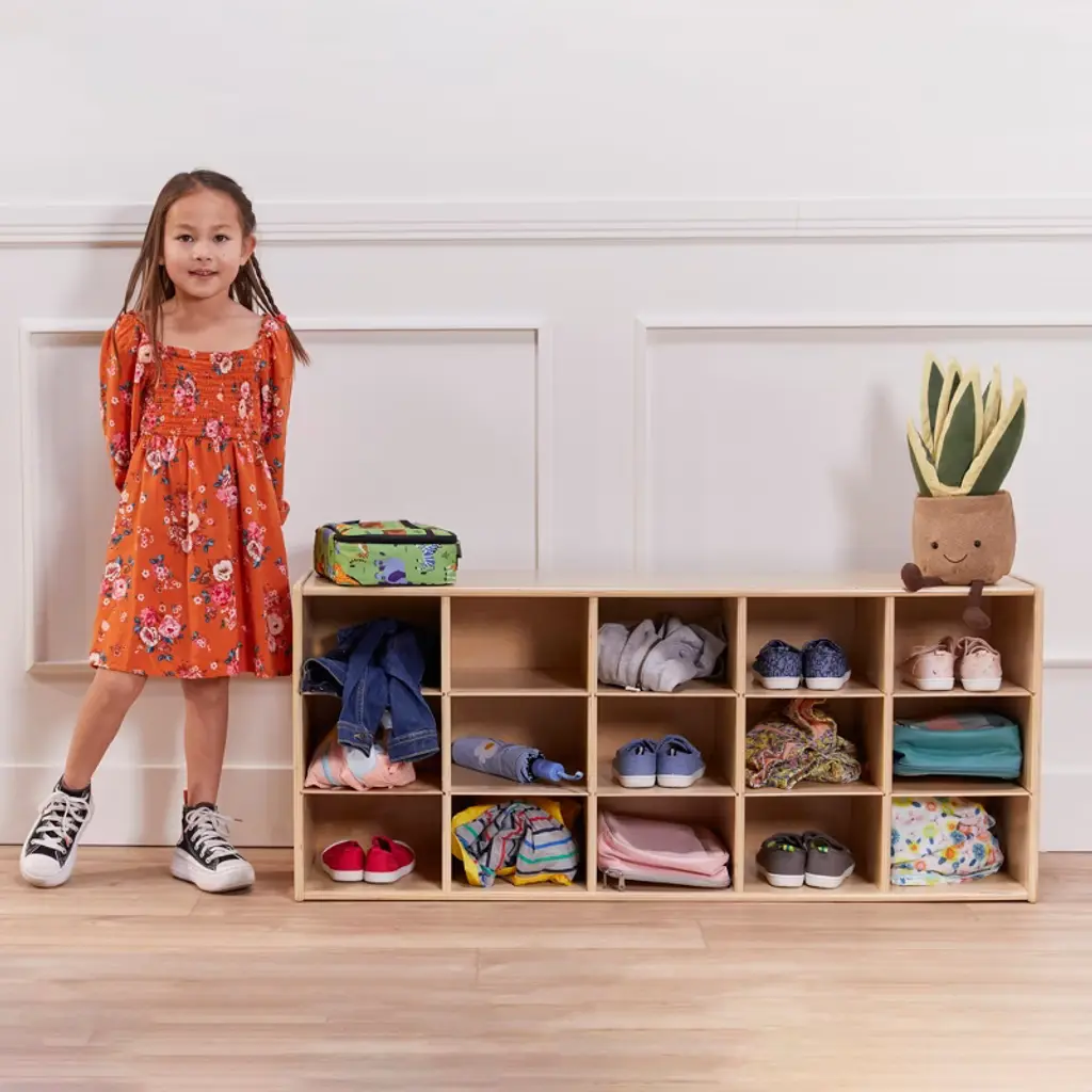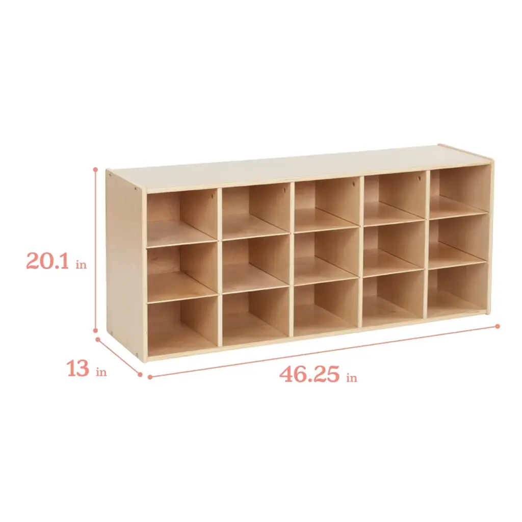 Keep your classroom uncluttered with the ECR4Kids Streamline 15 Cubby Tray Cabinet with Scoop Front Storage Bins. Ideal for small spaces, kids can organize and store toys, games, building blocks, and school supplies that may otherwise be forgotten. Designed to grow with little ones, this storage cabinet with bins helps parents, teachers, and educators keep small items within reach. Give children their own separate cubby at school to store art projects, homework, and personal belongings. Durable plastic bins feature rounded edges, an easy-to-grasp scoop front handle, and a curved interior to simply remove contents. Lightweight bins are easy to pick up and carry between activities. The low-profile open-face shelves encourage children to select their favorite activity independently and introduce organizational skills and clean up when playtime is over. Constructed from sustainably harvested birch plywood with a durable finish sealing the wood surface and resisting scratching. A UV inhibitor helps furniture resist ultraviolet light and yellowing. Natural birch plywood is extremely durable and will hold up to everyday use in an early childhood environment. Combine the Montessori storage with other ECR4Kids Birch Collection furniture pieces to complete the space.