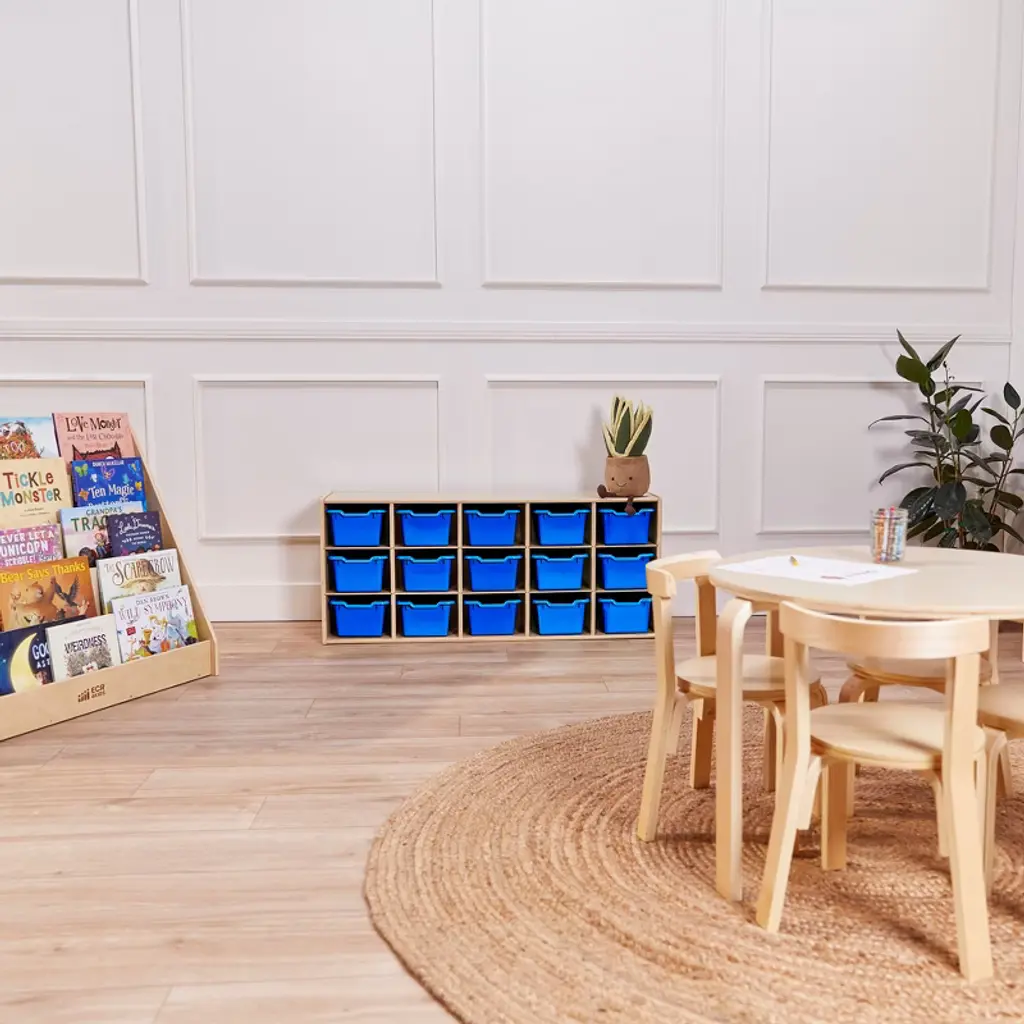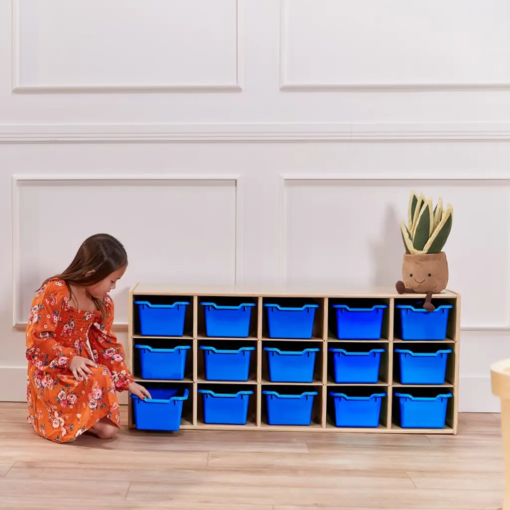 Ecr4kids Streamline 15 Cubby Tray Cabinet With 15 Scoop Front Storage Bins, 3X5, Natural, Blue