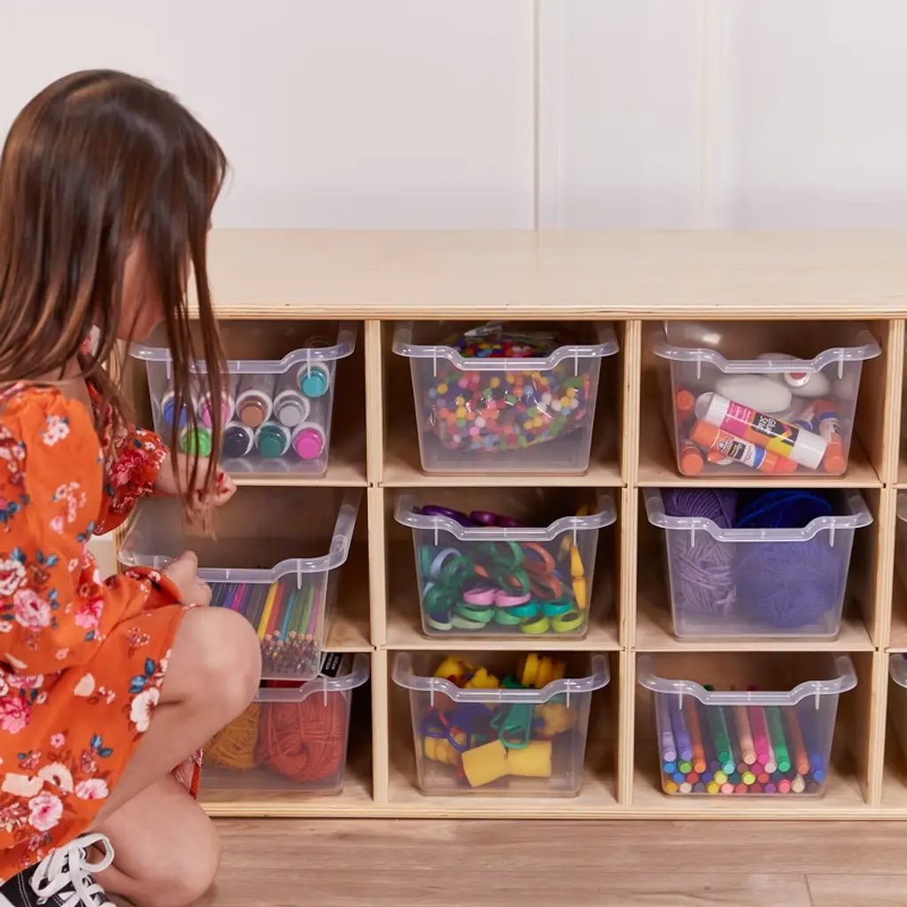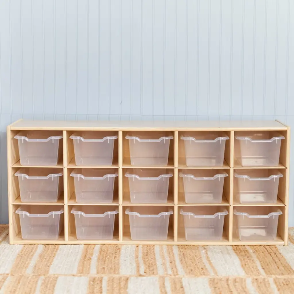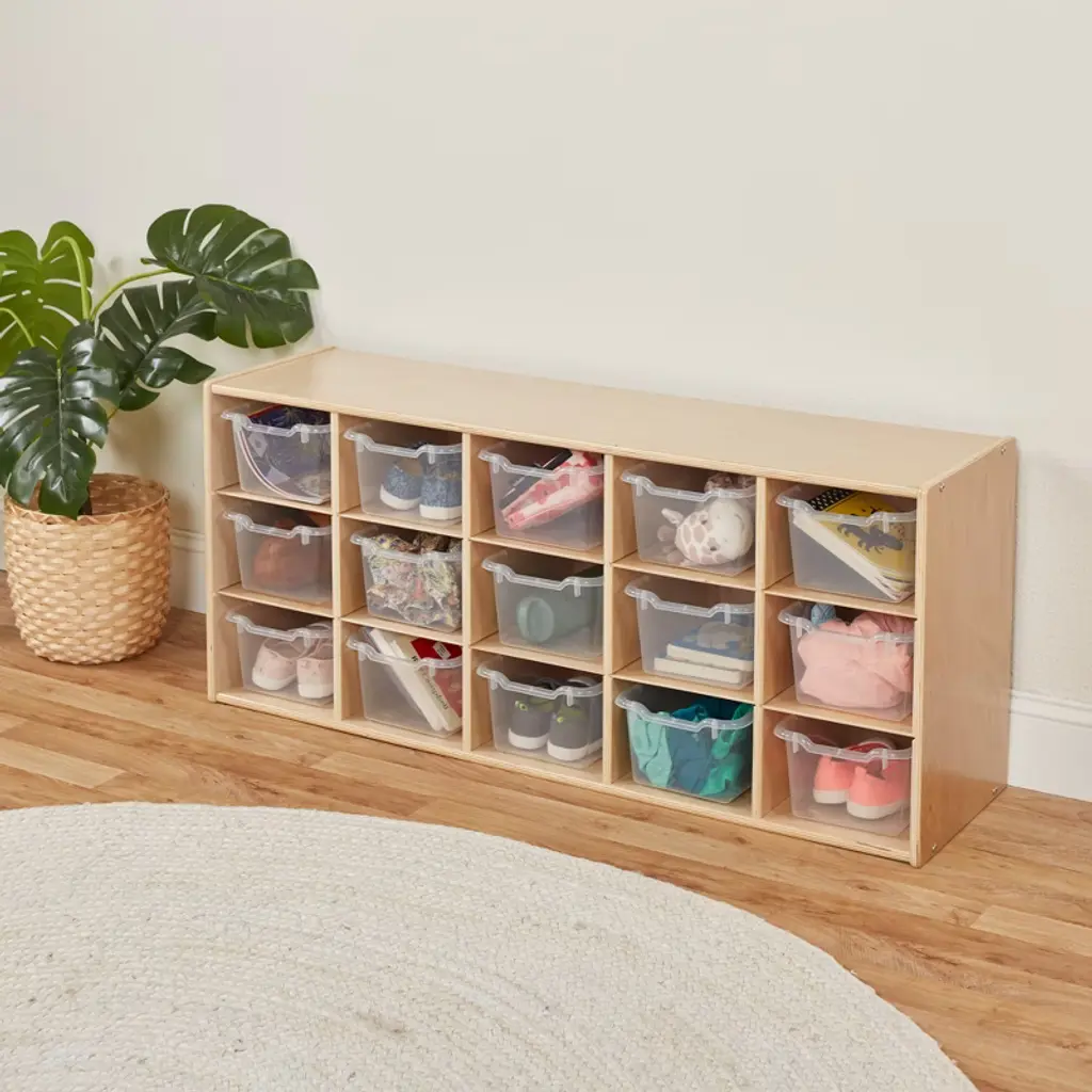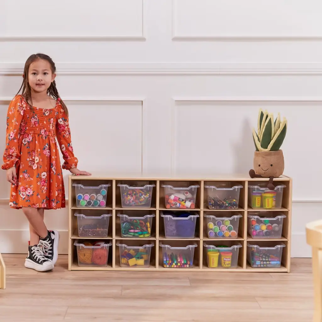 Ecr4kids Streamline 15 Cubby Tray Cabinet With 15 Scoop Front Storage Bins, 3X5, Natural, Clear