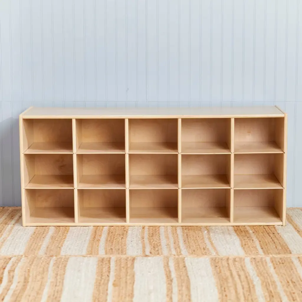 Keep your classroom uncluttered with the ECR4Kids Streamline 15 Cubby Tray Cabinet with Scoop Front Storage Bins. Ideal for small spaces, kids can organize and store toys, games, building blocks, and school supplies that may otherwise be forgotten. Designed to grow with little ones, this storage cabinet with bins helps parents, teachers, and educators keep small items within reach. Give children their own separate cubby at school to store art projects, homework, and personal belongings. Durable plastic bins feature rounded edges, an easy-to-grasp scoop front handle, and a curved interior to simply remove contents. Lightweight bins are easy to pick up and carry between activities. The low-profile open-face shelves encourage children to select their favorite activity independently and introduce organizational skills and clean up when playtime is over. Constructed from sustainably harvested birch plywood with a durable finish sealing the wood surface and resisting scratching. A UV inhibitor helps furniture resist ultraviolet light and yellowing. Natural birch plywood is extremely durable and will hold up to everyday use in an early childhood environment. Combine the Montessori storage with other ECR4Kids Birch Collection furniture pieces to complete the space.