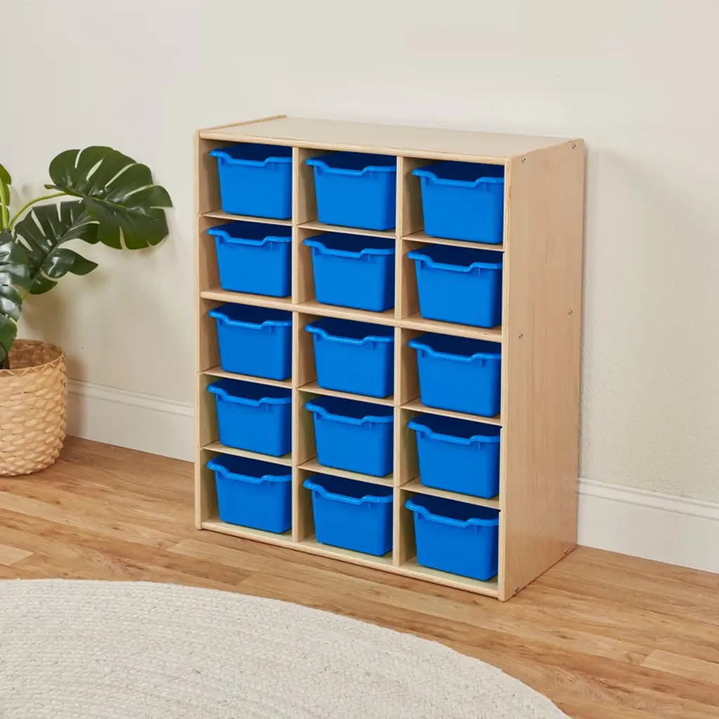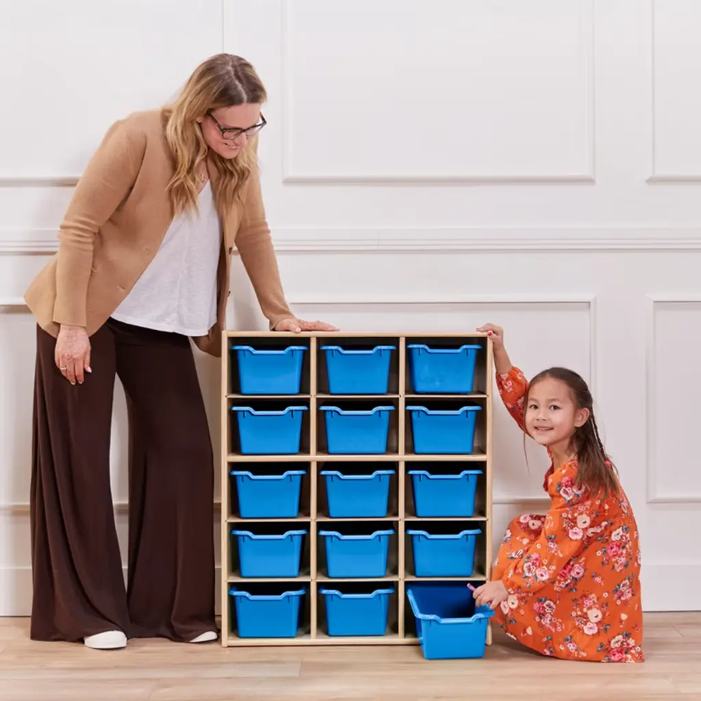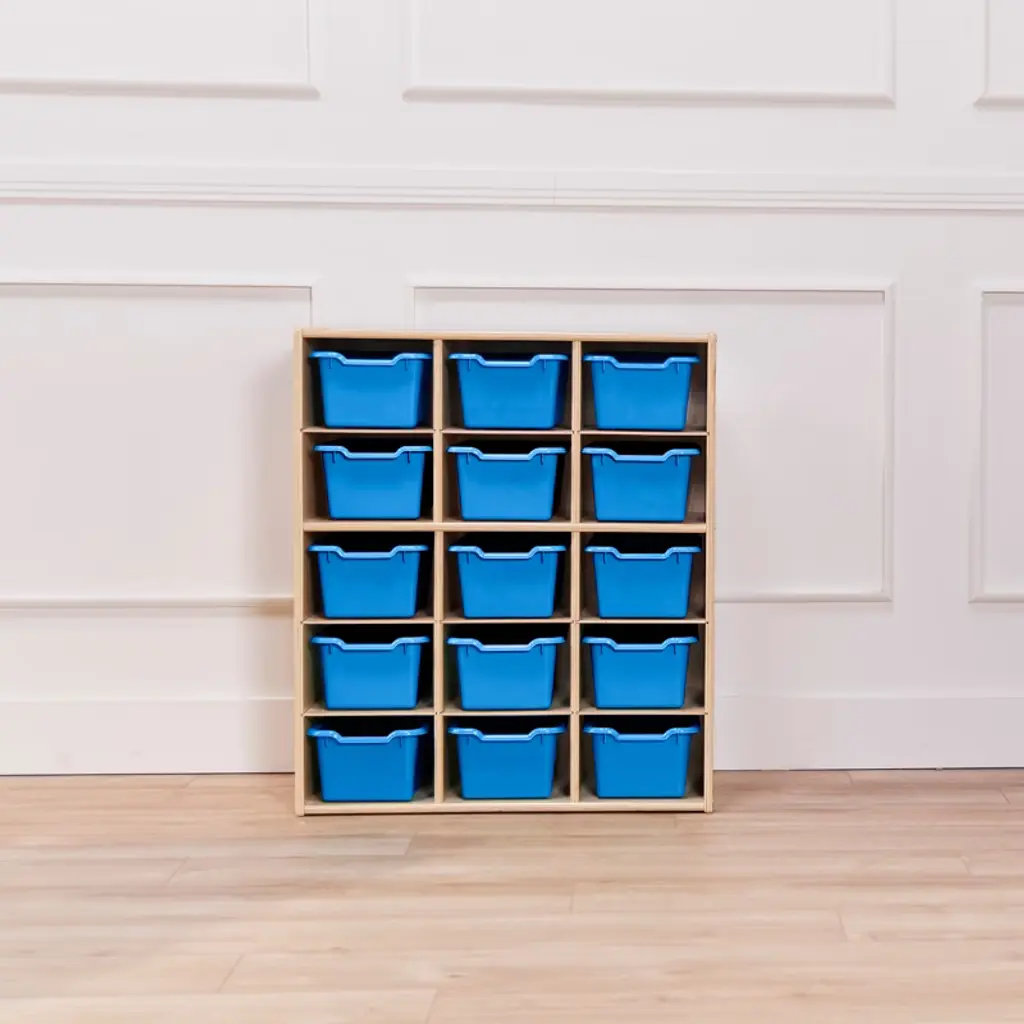 Ecr4kids Streamline 15 Cubby Tray Cabinet With 15 Scoop Front Storage Bins, 5X3, Natural, Blue