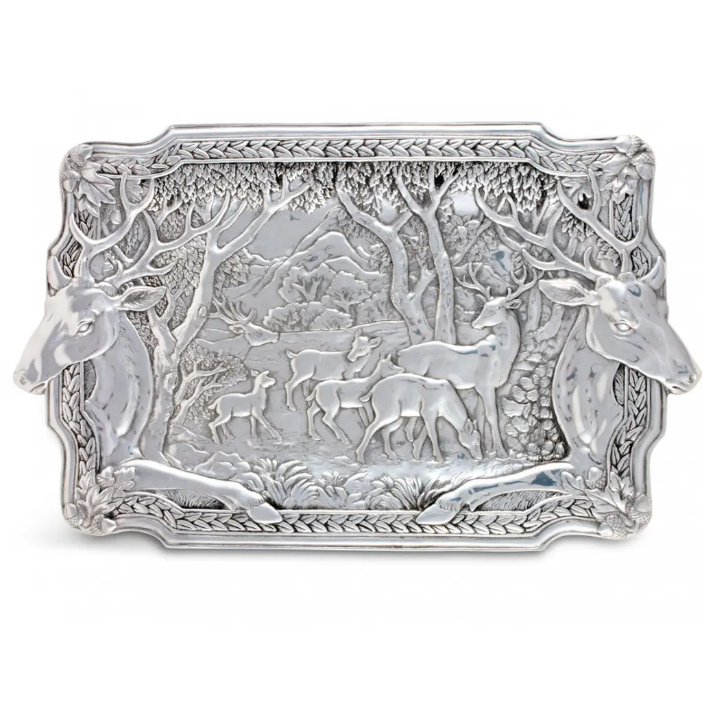 The Arthur Court clutch trays are presentation pieces that make entertaining simple. The 20-1/2-inch in length and 14-1/2-inch in width measurements offer ample serving space. Accented on each end by a handle, the tray is easily maneuvered to be used where you need it. Every inch of this handmade, aluminum piece is elegantly detailed, its layers and depth pulling you in like the picture pages of a book. Elephants roam at the base of a mountain while the weaving branches, leaves and vines of a dense forest surround them in this breathtaking design.