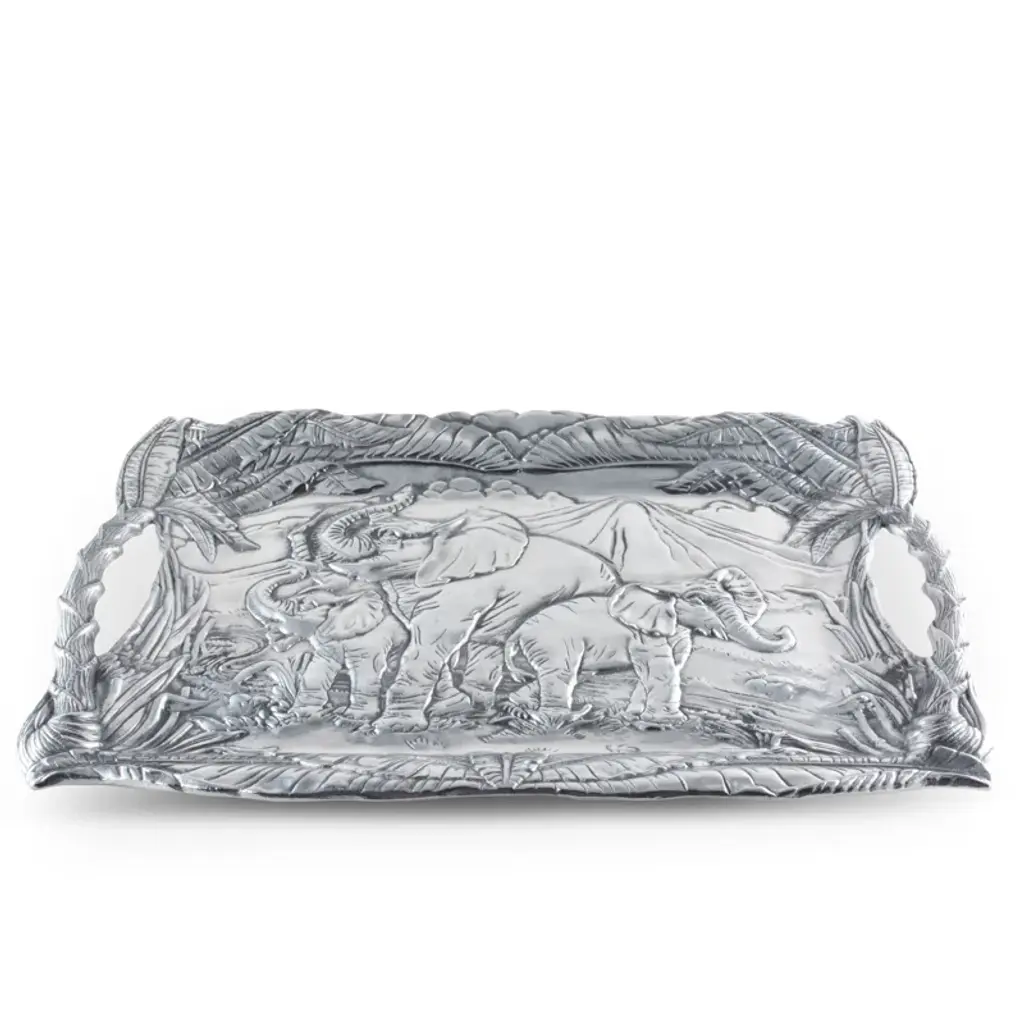 Invite the entire herd over for dinner with this Elephant Oblong Tray from Arthur Court. A group of elephants play in the center of this piece, their trunks flailing in excitement at the company they keep. Cheetahs and birds wait in the dense brush surrounding the elephants, with the dark border acting as a frame for this handmade, aluminum setting.