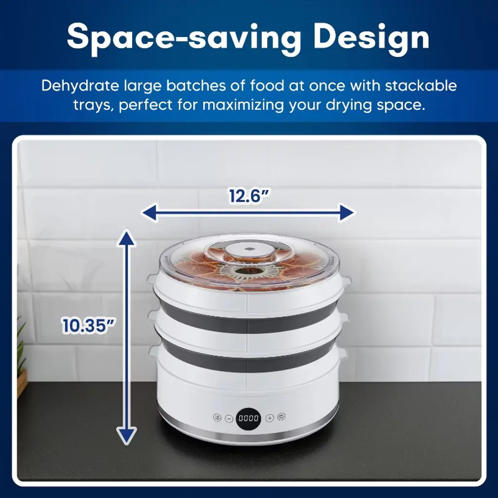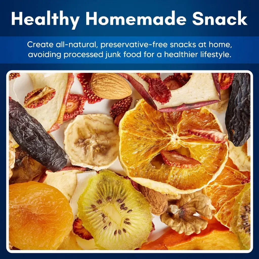 Enjoy tasty, nutritious, and low-calorie snacks at home with the Elite Cuisine Digital 5-Tray Food Dehydrator. With 350 watts of drying power, it quickly dehydrates a variety of fruits, vegetables, meats, and more! The digital panel features preset temperatures of 95°F, 104°F, 113°F, 122°F, 131°F, 140°F, 149°F, and 158°F, along with an adjustable 48-hour timer for optimal drying of different foods. Its base-mounted fan and heater create an airflow system that ensures even and consistent drying. The 5 BPA-free stacking trays provide 410 square inches of drying space, making it perfect for fruits, vegetables, spices, herbs, and jerky. When you’re done, the trays conveniently nest to save storage space. Dehydrating is easy—just prepare your favorite foods, dehydrate, package, and store for months. Cleanup is a breeze with dishwasher-safe trays or simply wash with warm, soapy water, rinse, and let dry.