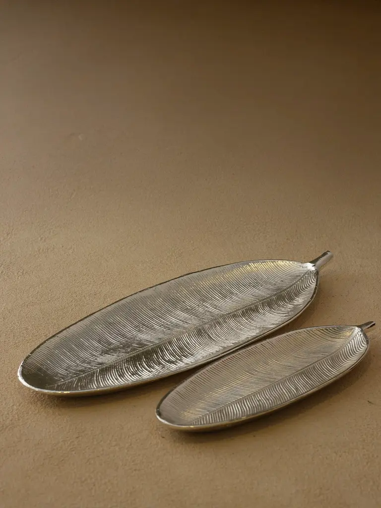 Inspired by the graceful lines of a tropical leaf, this elongated tray is handcrafted from solid brass and finished in a muted metallic sheen. Fine vein detailing adds texture and depth, creating a piece that feels both refined and organic. Whether used to serve delicacies, display candles, or simply as a sculptural accent on a console or coffee table, this tray brings natural elegance and contemporary charm to any setting. A versatile addition to curated interiors with a love for artisanal statement pieces.