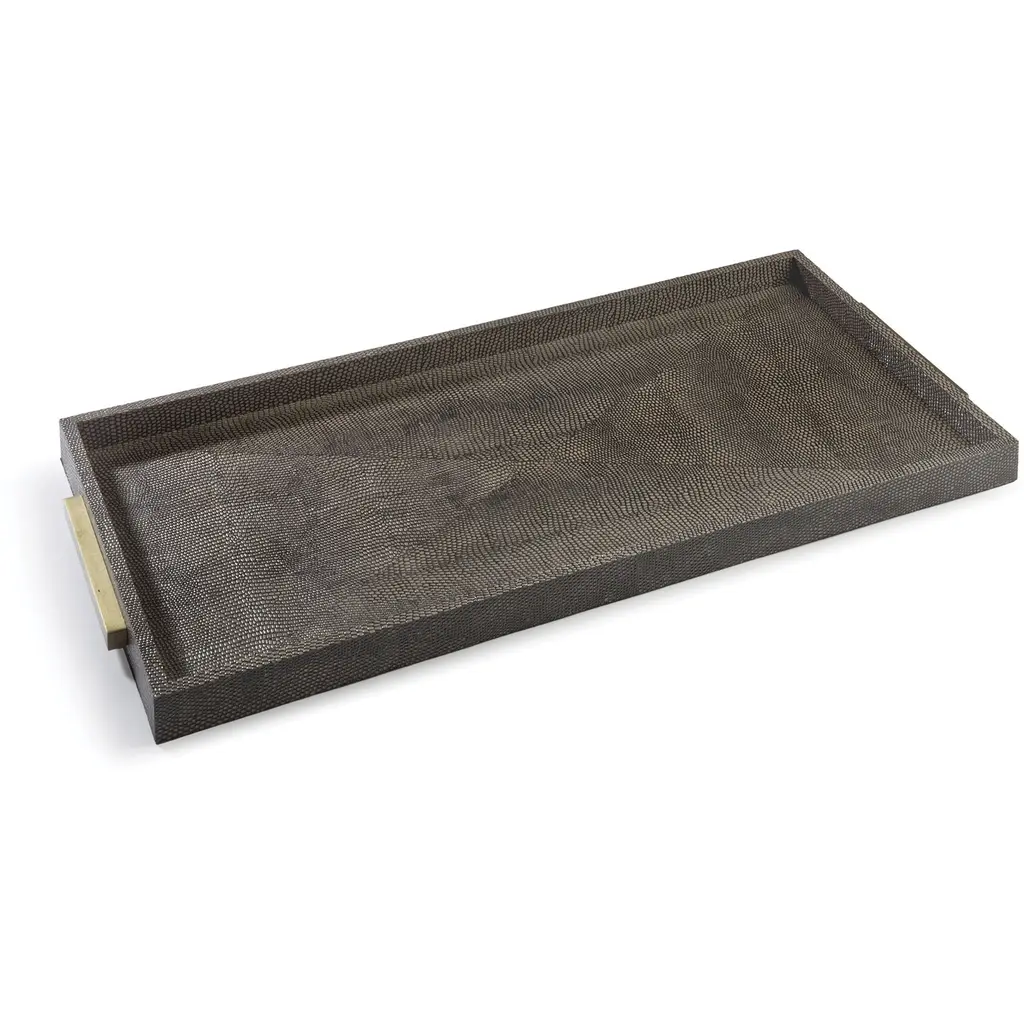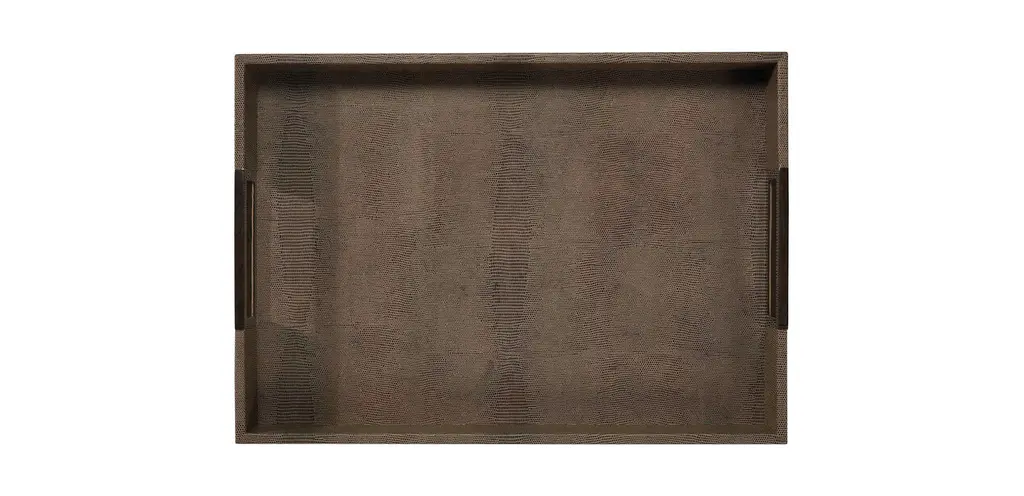 This leather tray serves up modern textural style anywhere you need it—and it’s sized to carry more than a few drinks and refreshments. Finished in leather and embossed with a faux snakeskin print, its minimalist profile is accented by stylish hardware with a brilliant nickel finish. The result is a versatile, chic rectangular leather tray, offered in a shade of taupe that can live anywhere.