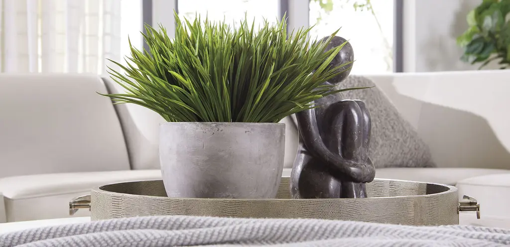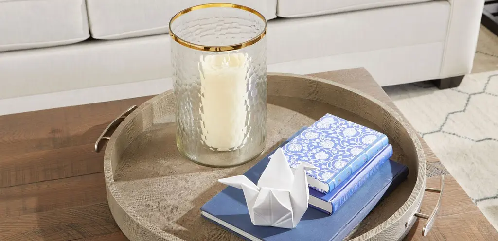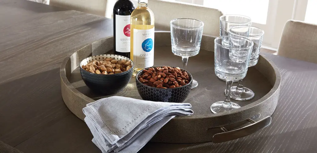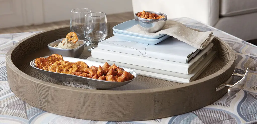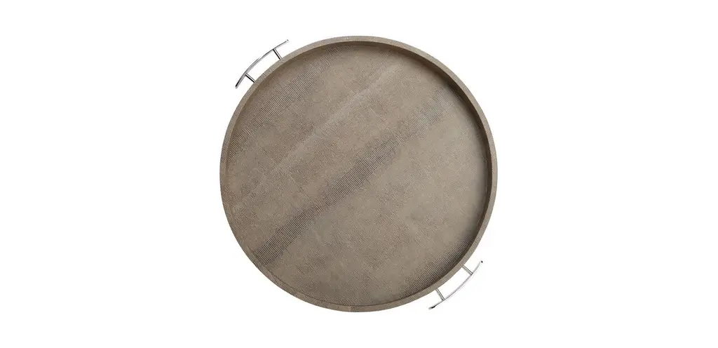 Serving up modern textural style anywhere you need it, this embossed, round leather tray is sized to carry lots of refreshments. Offered in a shade of taupe that can live anywhere and embossed with a faux snakeskin print, this leather tray is accented by stylish hardware with a brilliant nickel finish.