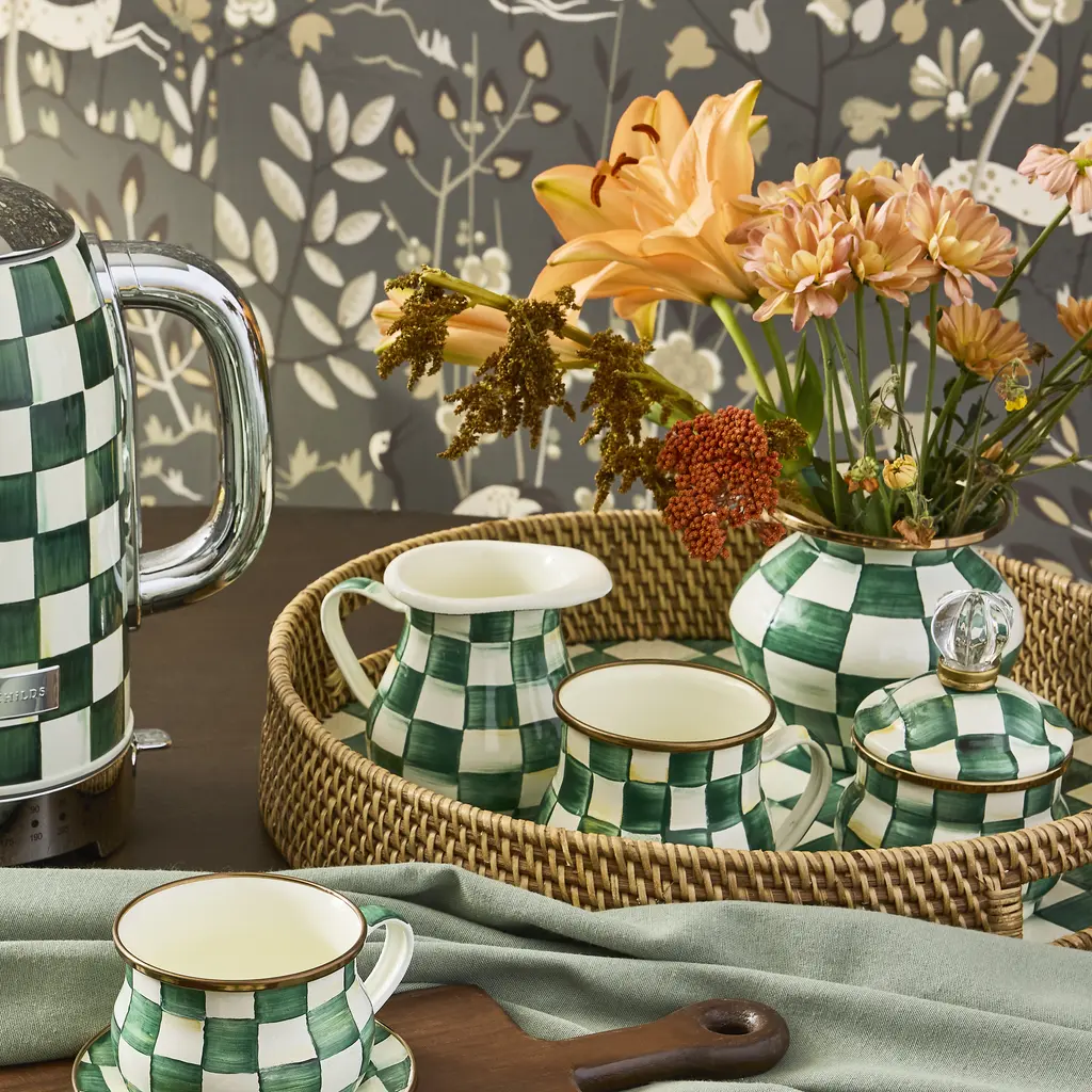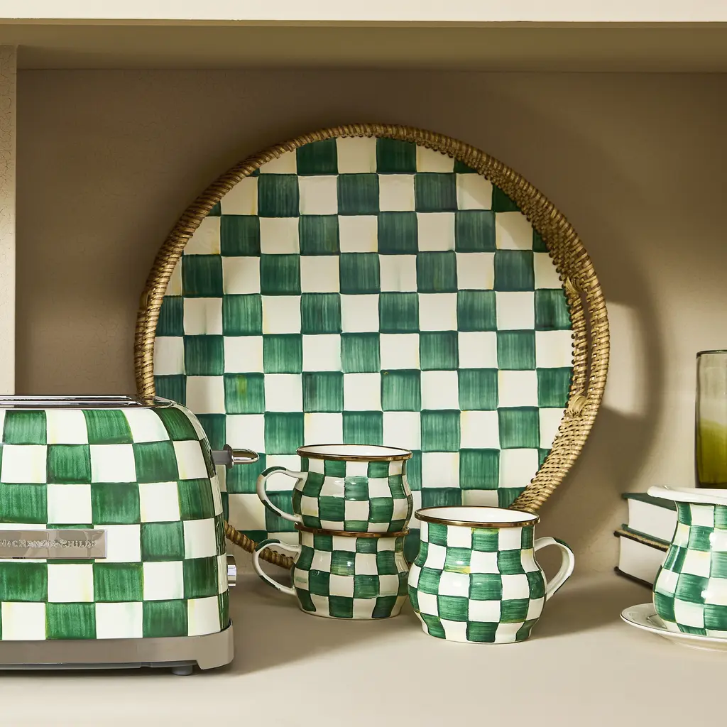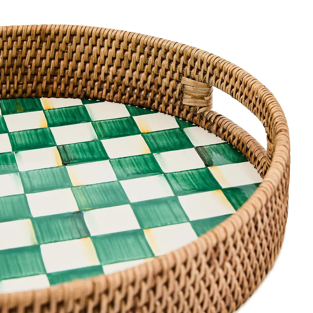 Serve in style with our Emerald Check Enamel & Rattan Round Serving Tray, a perfect blend of elegance and practicality. The vibrant check pattern is beautifully paired with the rich texture of rattan, creating a striking contrast that's both chic and functional. Ideal for entertaining in style or elevating any tablescape, this tray brings color and charm to the home.