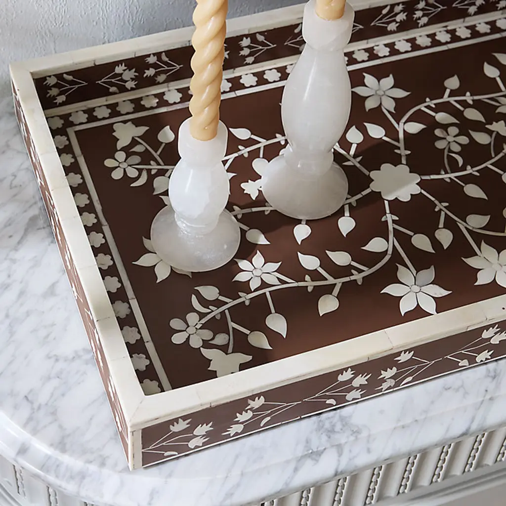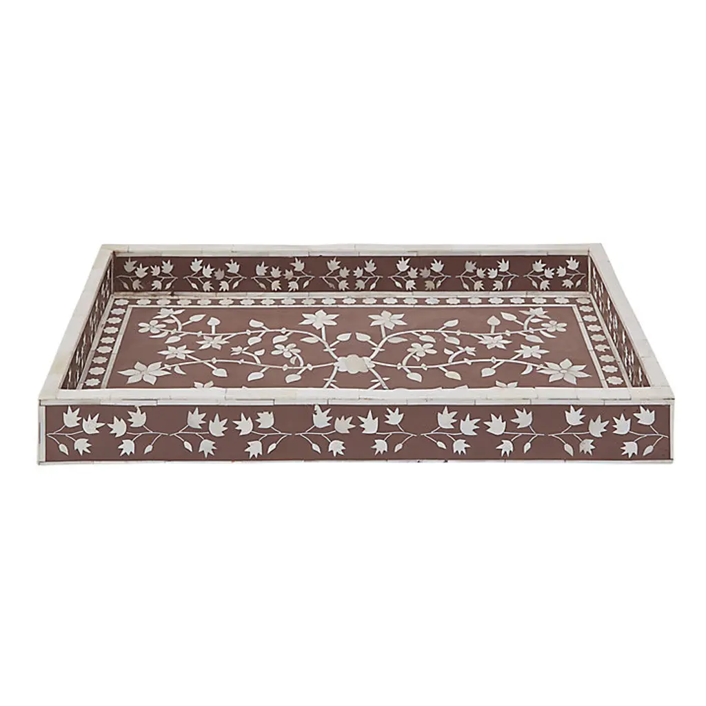 Our Emerie Floral Tray is so striking, it deserves centerstage on your coffee table, entry console, or dining room server. The intricate floral motif and trim are meticulously hand crafted of found bone and inlaid over rich brown wood. Felt pads on the bottom protect your surfaces. Expect beautiful variations in the bone's natural tone and shading. Emerie Floral Tray features: