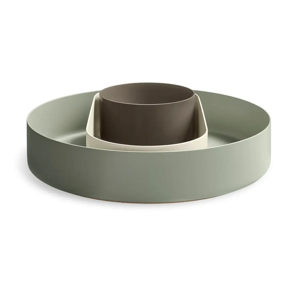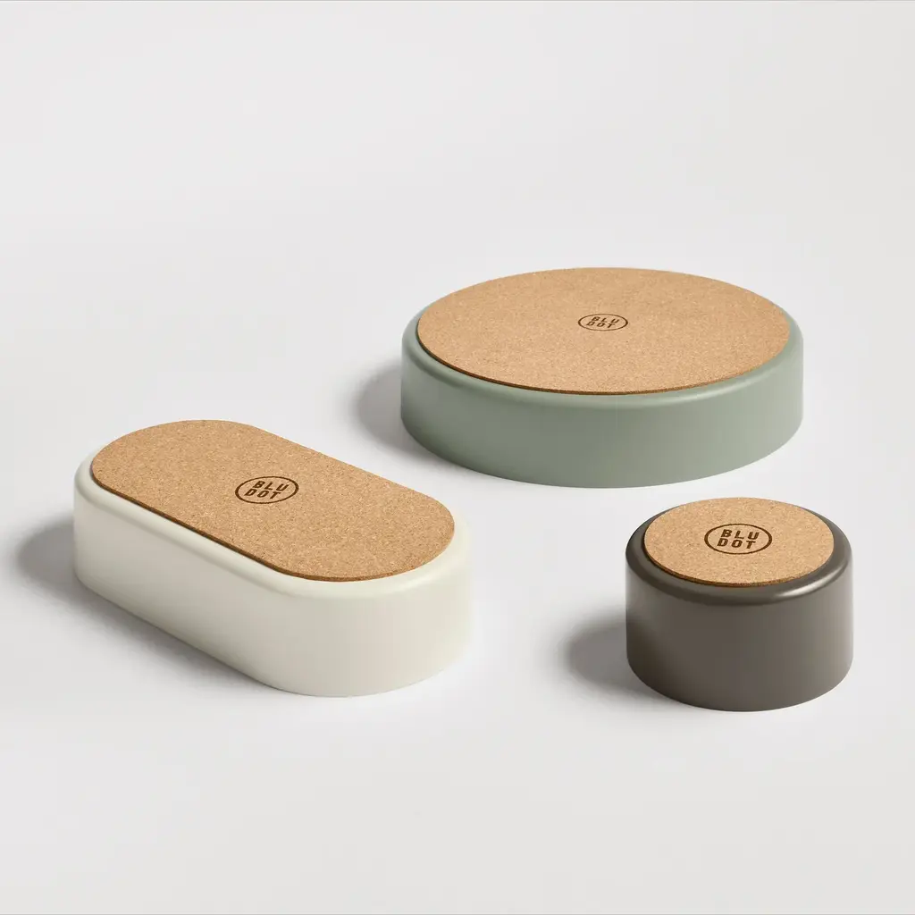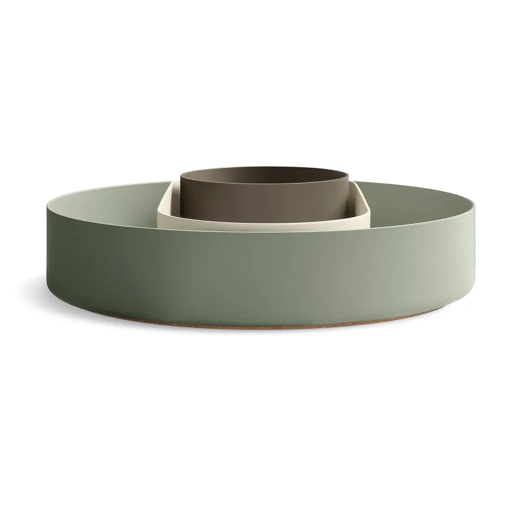 This powder-coated steel throuple brings harmony to your space and your stuff. Funky color combinations keep your jewelry, paperclips and random ephemera looking calm, cool, and collected. Cork pads protect surfaces and avoid slippage.