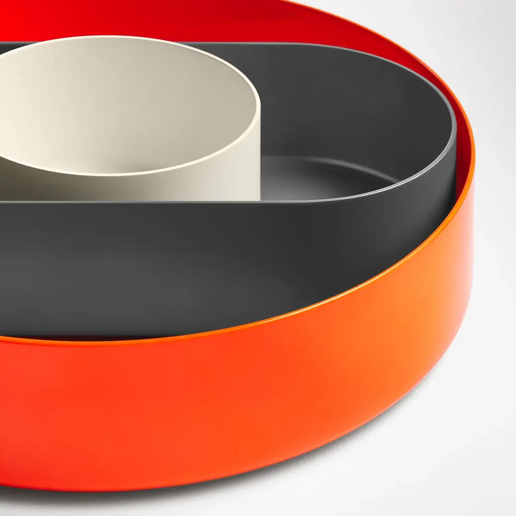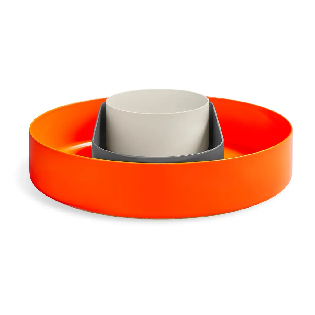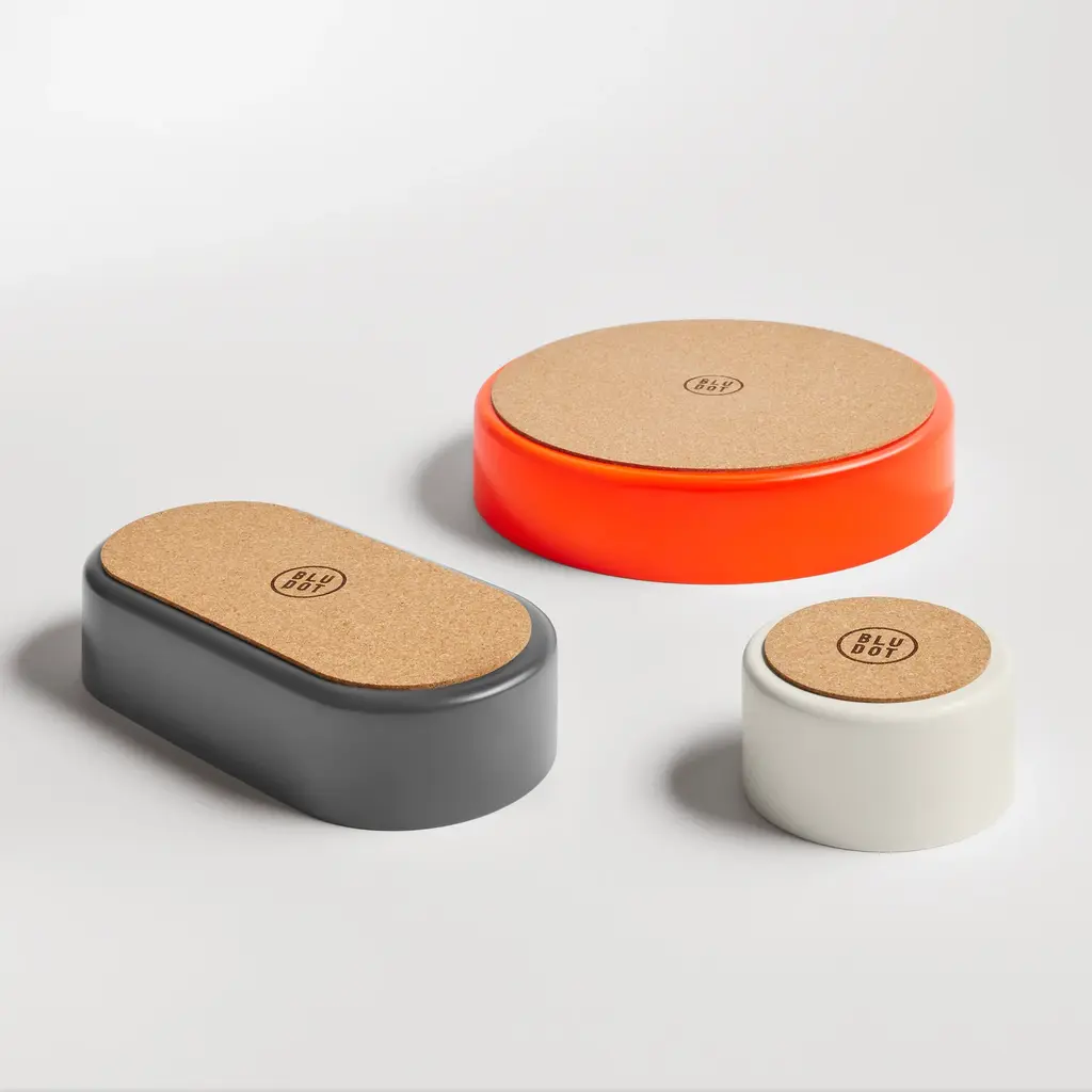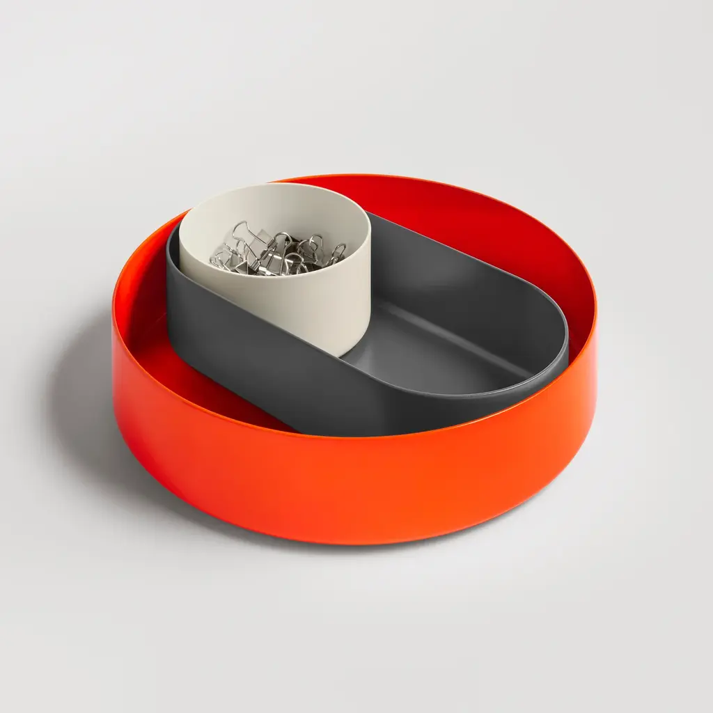 This powder-coated steel throuple brings harmony to your space and your stuff. Funky color combinations keep your jewelry, paperclips and random ephemera looking calm, cool, and collected. Cork pads protect surfaces and avoid slippage.