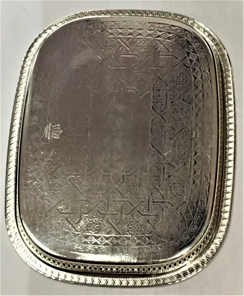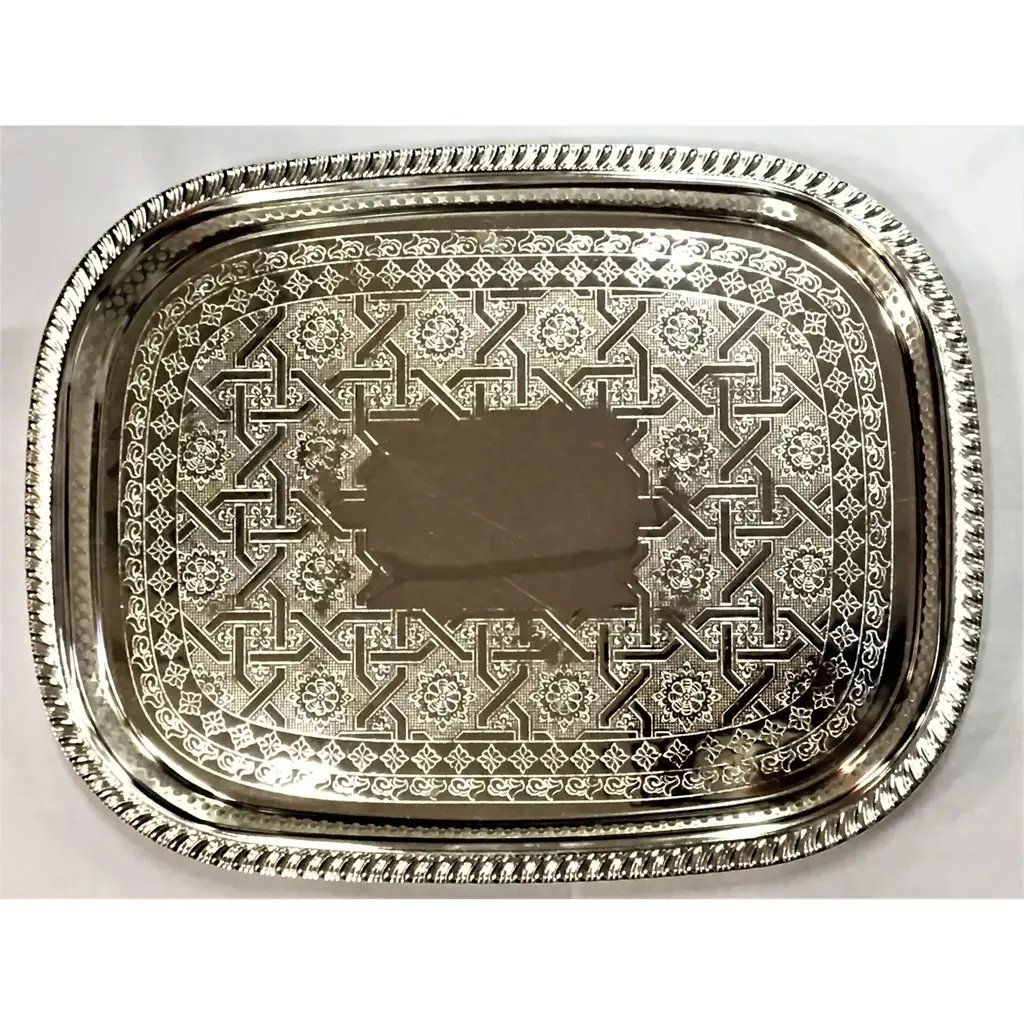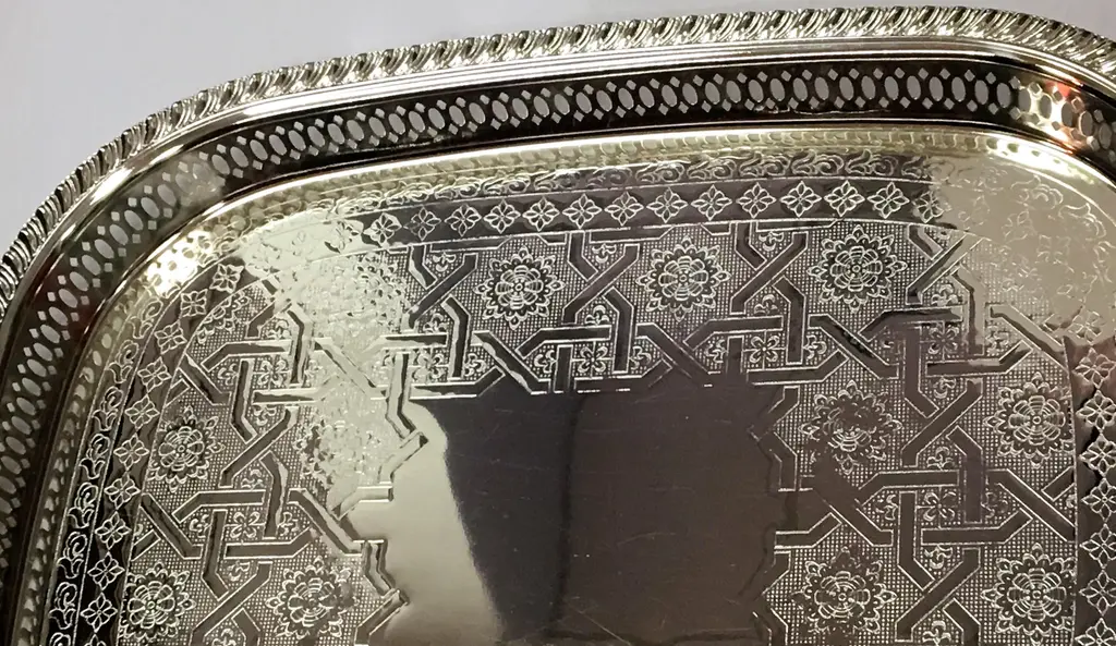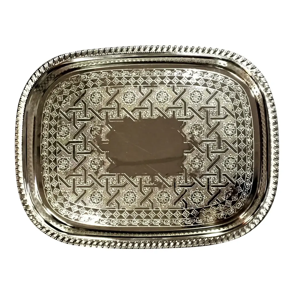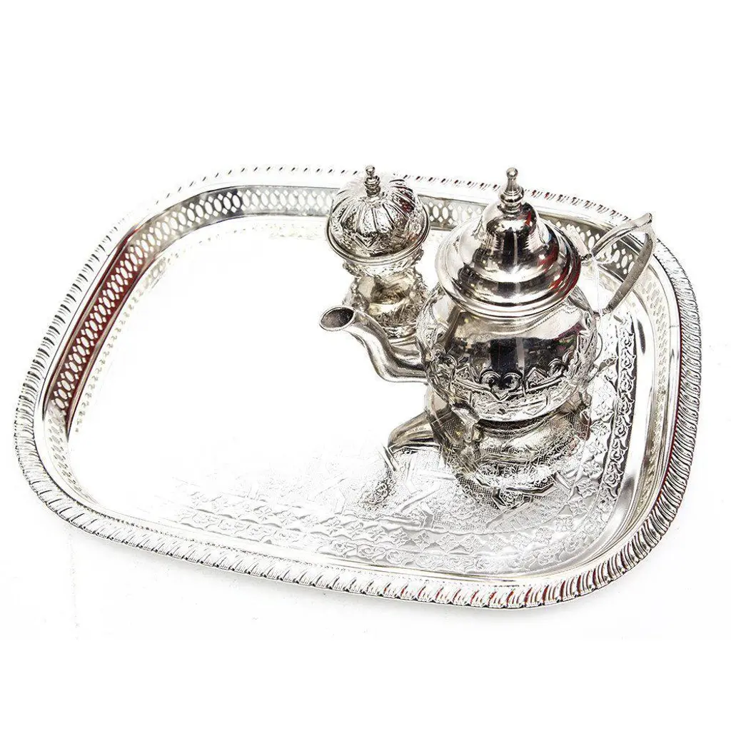 Impress guests with this stunning, rectangular Engraved Silver Moroccan Tray made of beautiful silver and engraved in the traditional style. While it is ideal for serving, it can also be paired with our Moroccan table legs to complete an exotic table. Will add a touch of elegance and distinction to any room. (Teapot not included.)