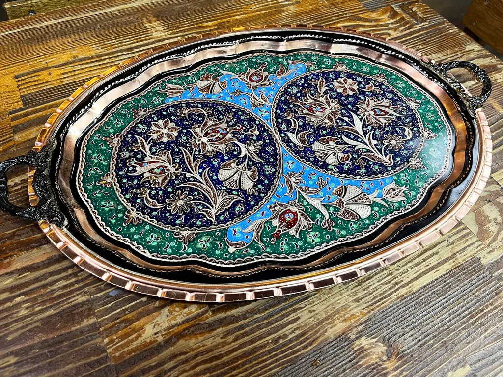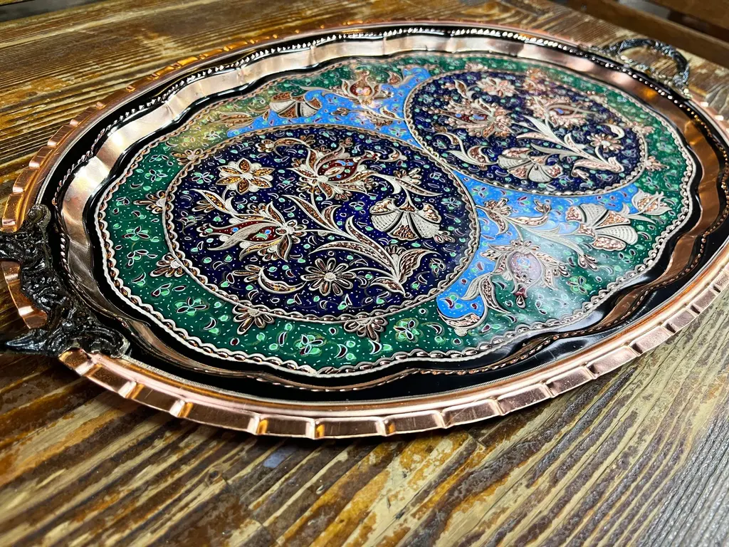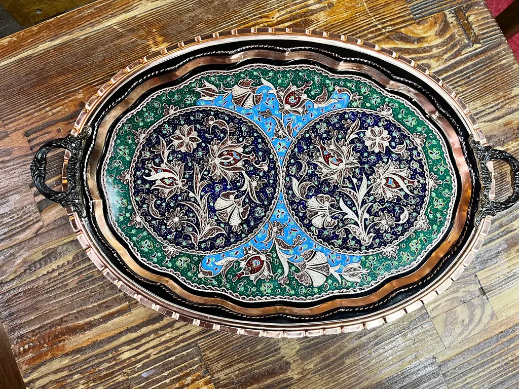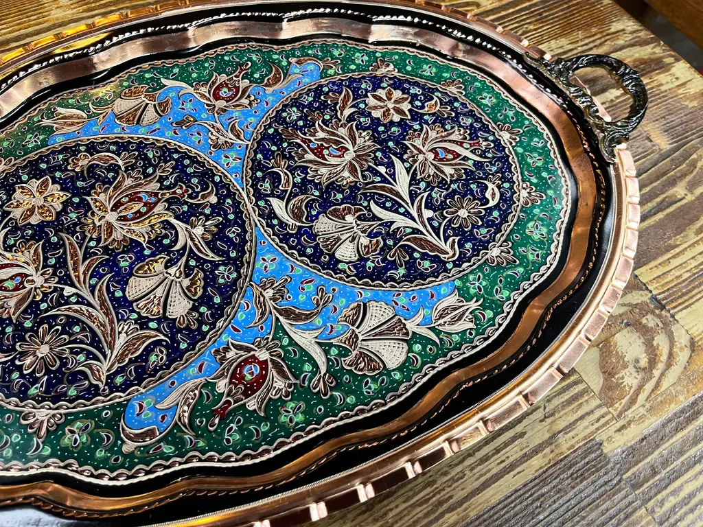 Handmade engraved oval tray with handles made by copper. Inlaid flower design and perfect for serving. Great for displaying your unique decoration. Would make a wonderful gift. Sizes; Width: 45 cm \.17.7 inches Height: 35 \.13.8 inches My items are all unique and one of a kind. You can wash my items with your hand and you need to dry it properly. All hand painted, hand carved, varnished and waterproof.