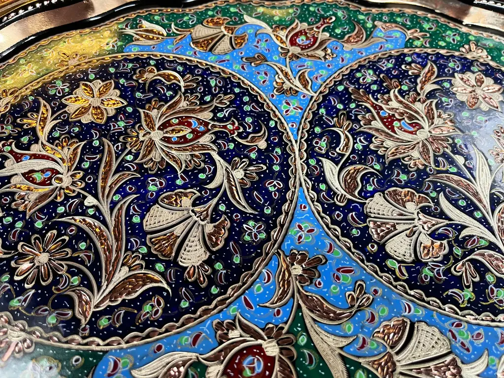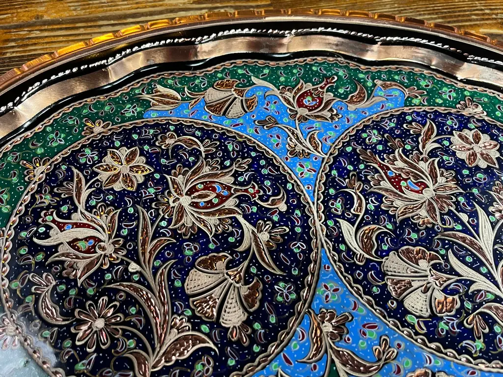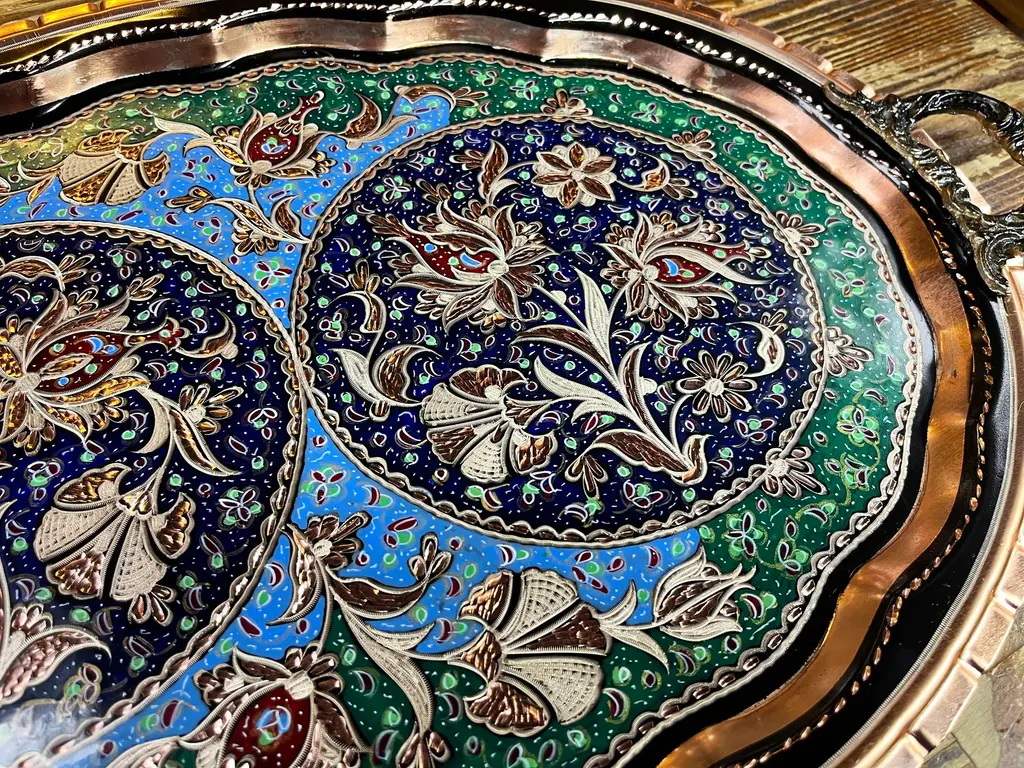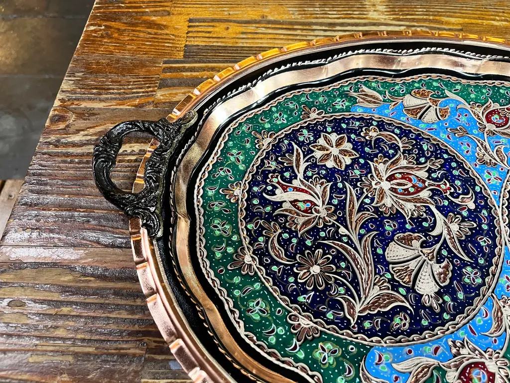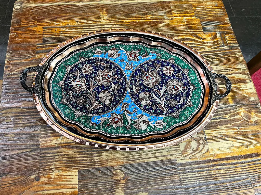 Handmade engraved oval tray with handles made by copper. Inlaid flower design and perfect for serving. Great for displaying your unique decoration. Would make a wonderful gift. Sizes; Width: 45 cm \.17.7 inches Height: 35 \.13.8 inches My items are all unique and one of a kind. You can wash my items with your hand and you need to dry it properly. All hand painted, hand carved, varnished and waterproof.