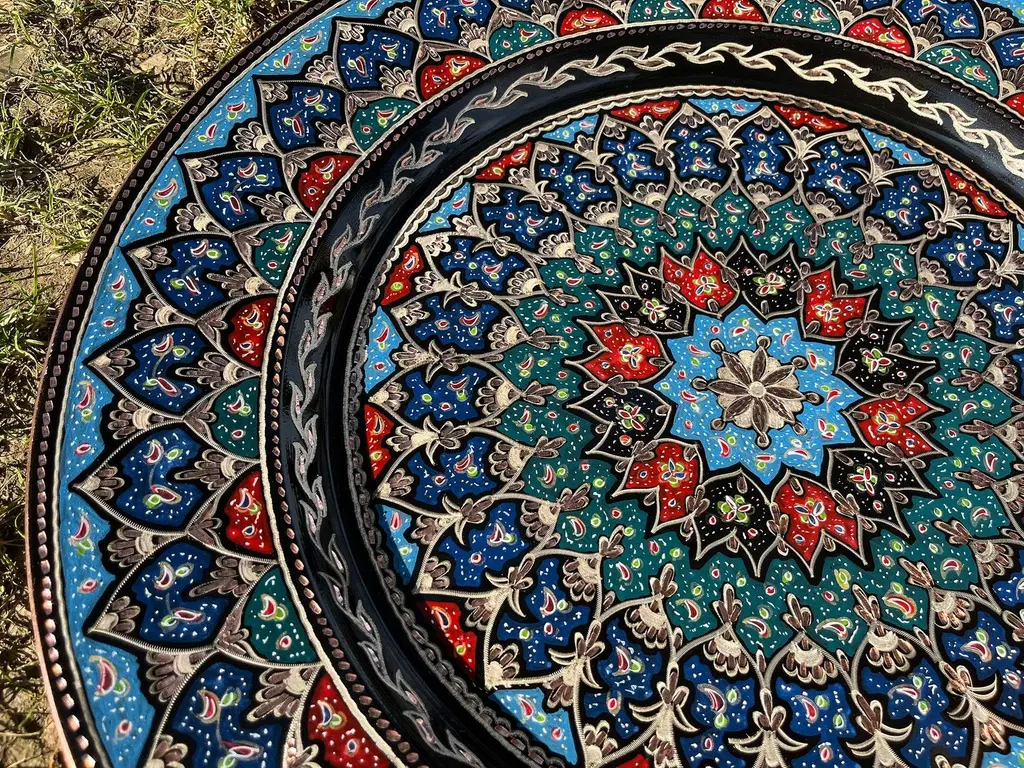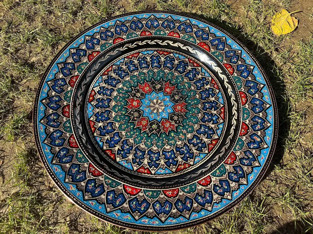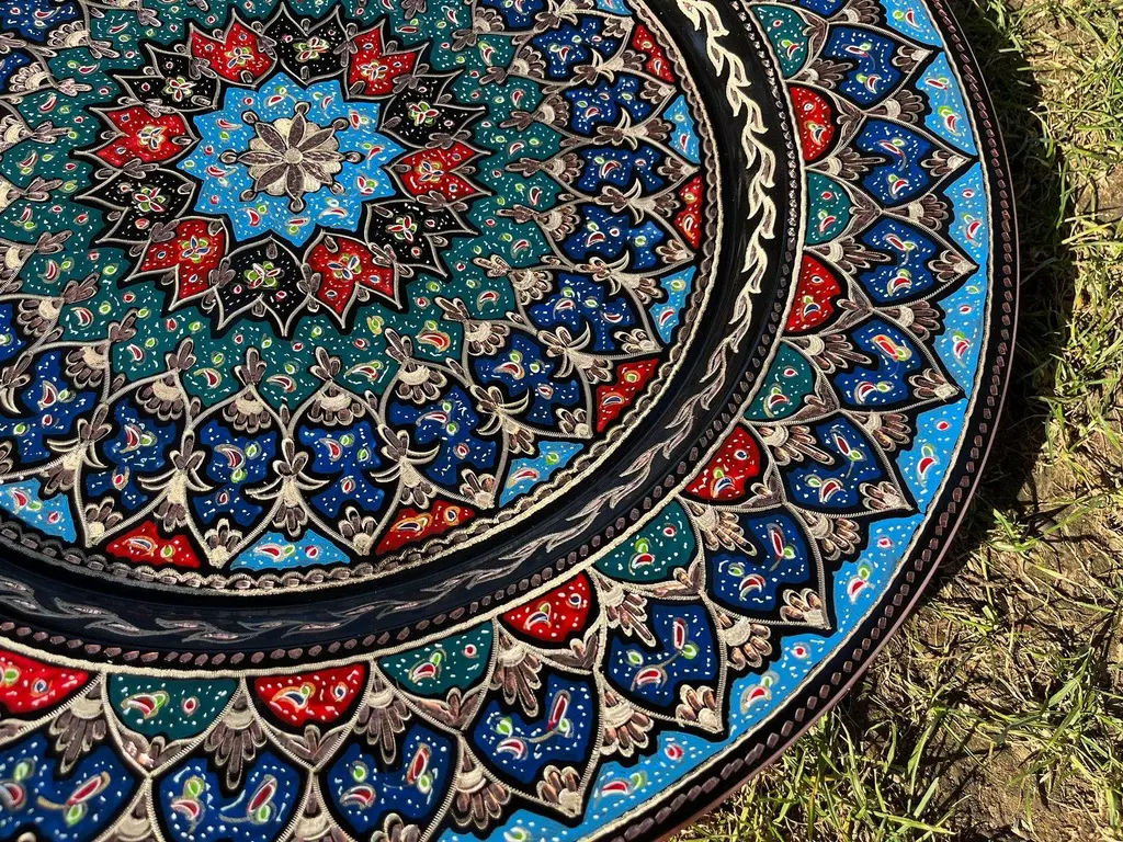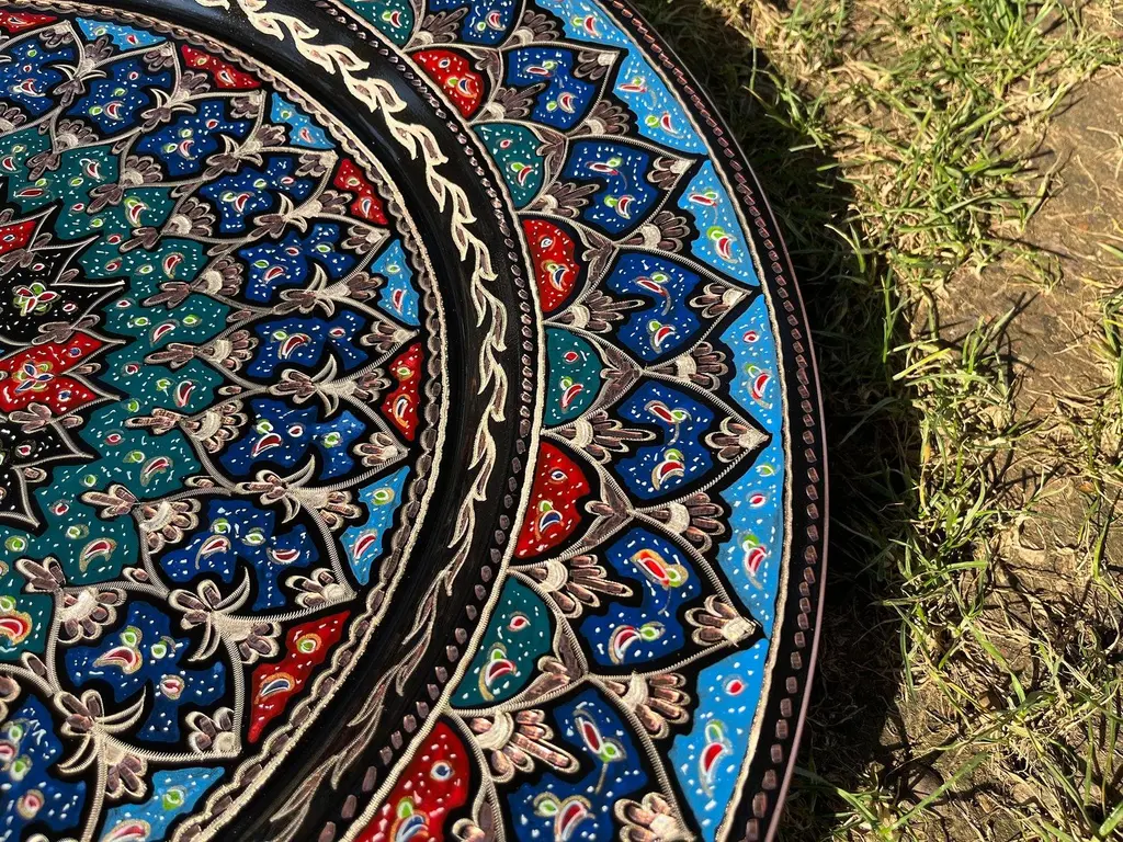 Modern style hand made wall plate round tray made by copper. Colorful design for wall. Great for displaying your unique decoration. Hand painted plates can be hung to create wonderful wall art. There is an insert on the back of the plate for hanging. SIZE: 43 CM / 17 INCH