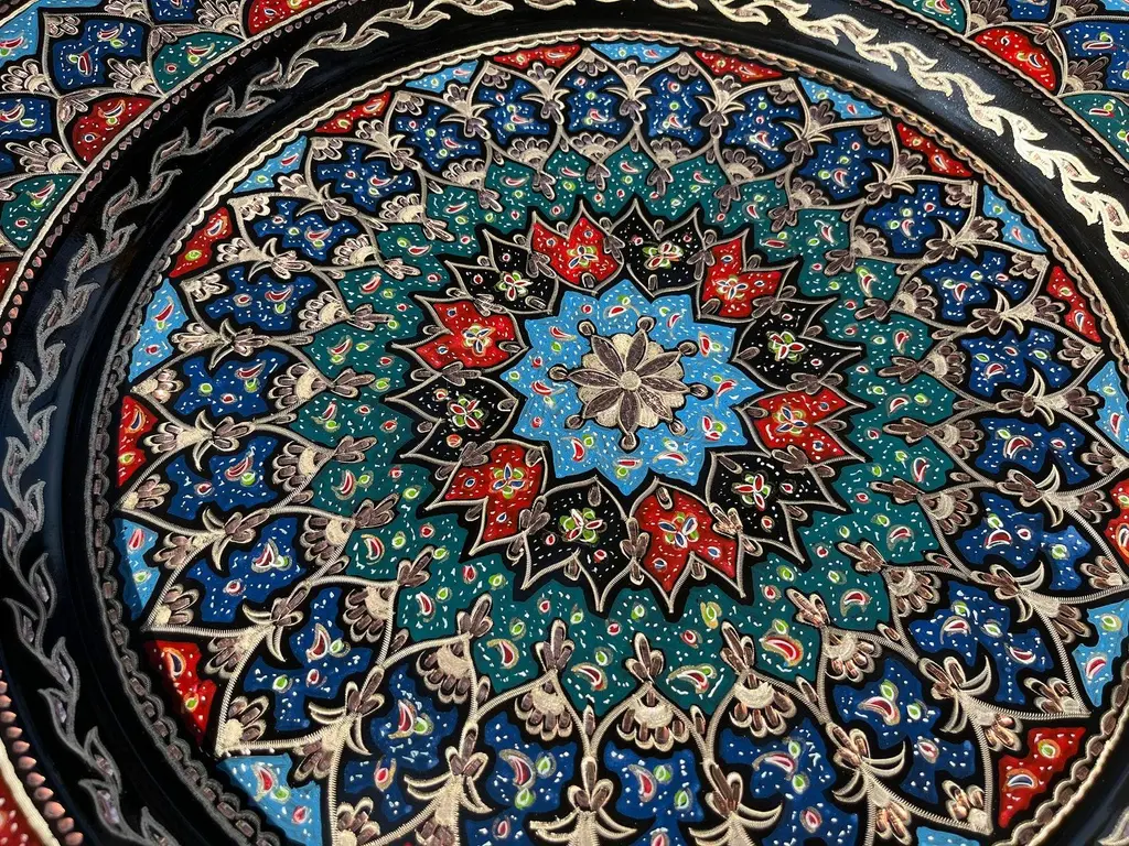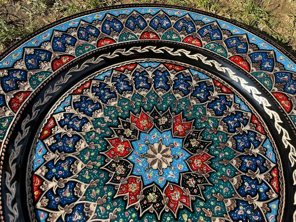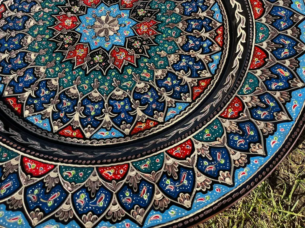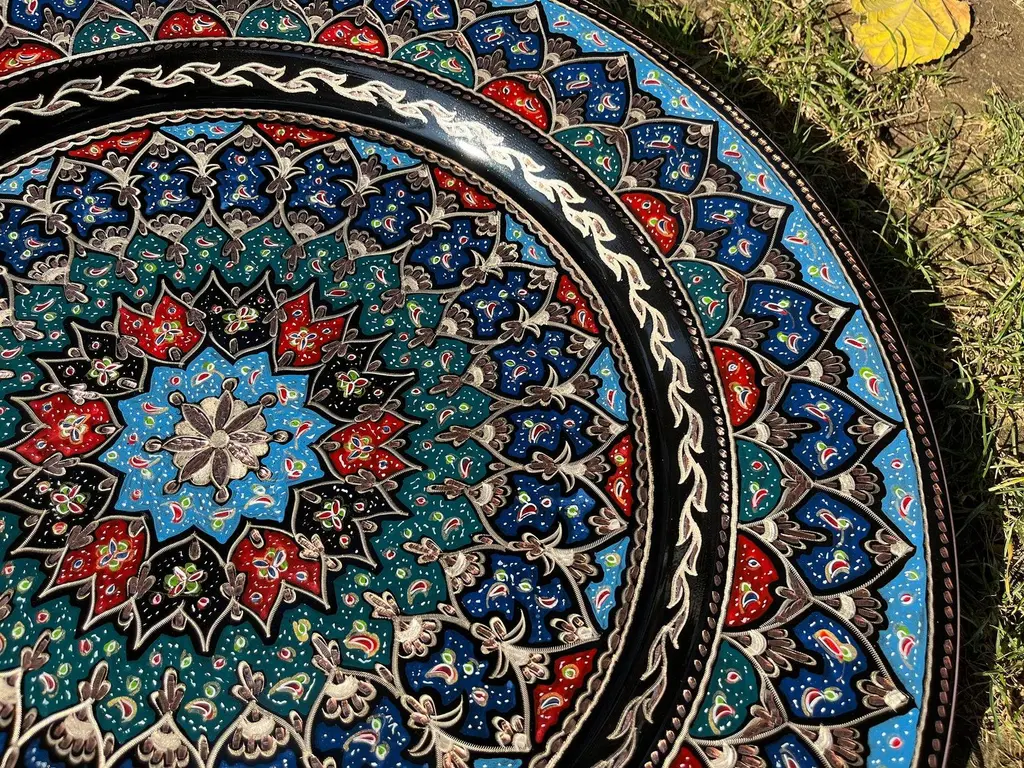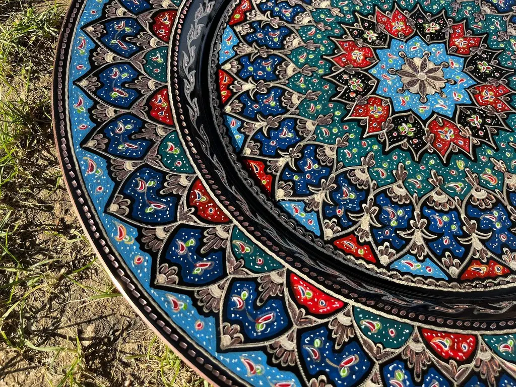 Modern style hand made wall plate round tray made by copper. Colorful design for wall. Great for displaying your unique decoration. Hand painted plates can be hung to create wonderful wall art. There is an insert on the back of the plate for hanging. SIZE: 43 CM / 17 INCH