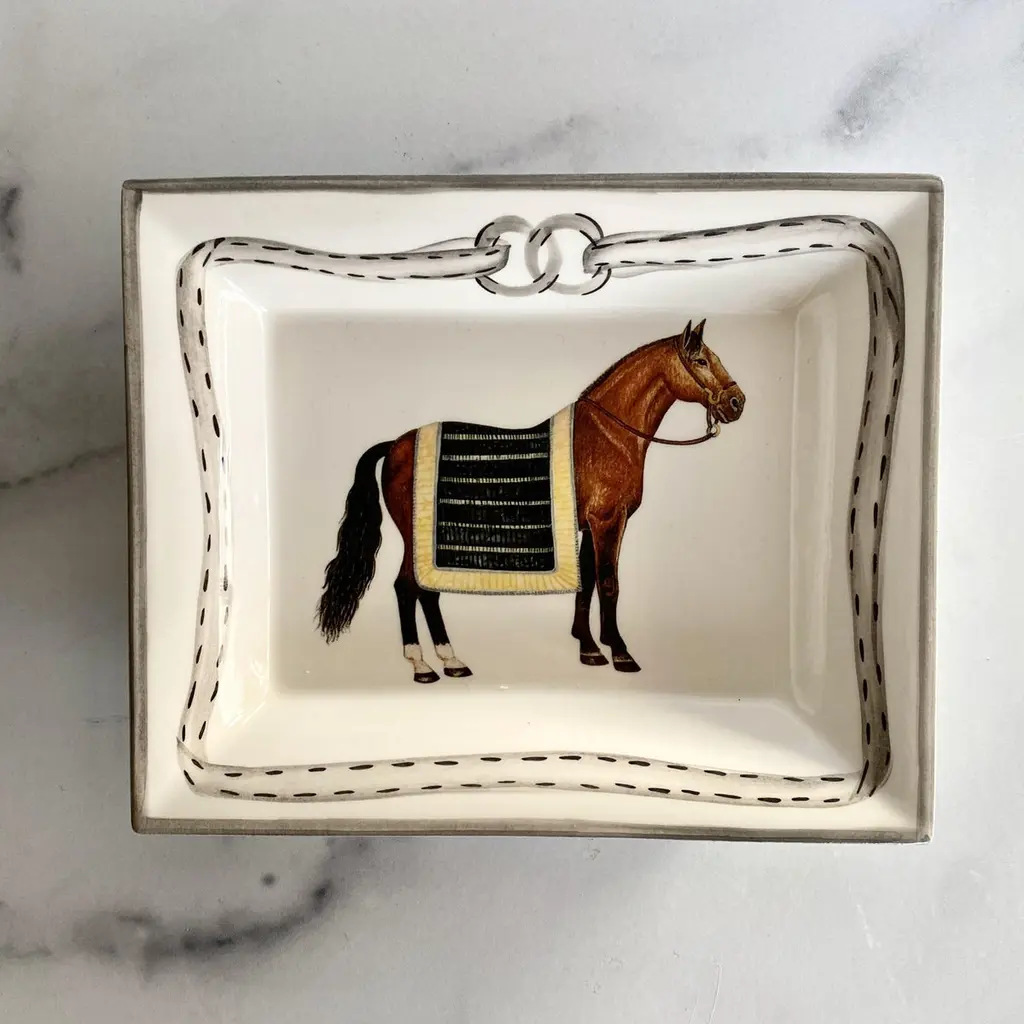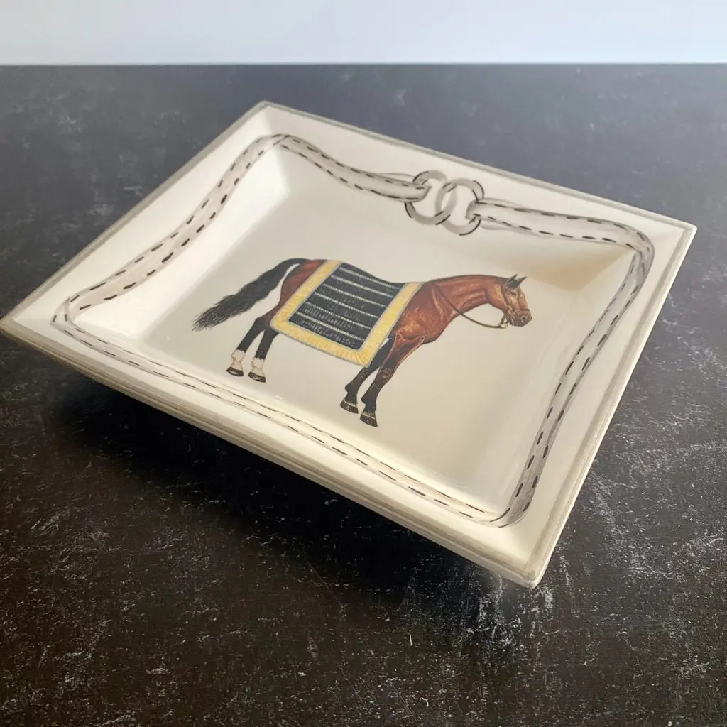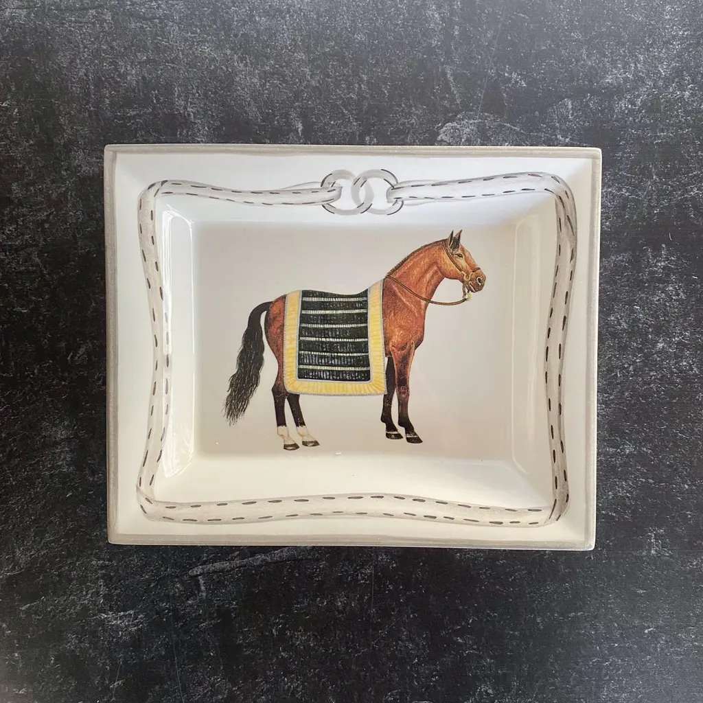Equestrian "Devon" Change Tray, Black/Yellow Stripe. Made in Italy for The Mane LionThe Mane Lion was born in 1979 in the heart of Philadelphia's fabled Main Line, offering a line of charming, hand-painted chip-and-dip serving pieces that enhanced the act of entertaining. Today, The Mane Lion continues to pursue that passion to create something that is particular and of the highest quality. We are proud that our products are crafted by master artisans in the best Italian factories, some of them generations old. Centuries of experience have enabled the Italians to produce the finest, most durable, most beautiful ceramic dishes on earth.