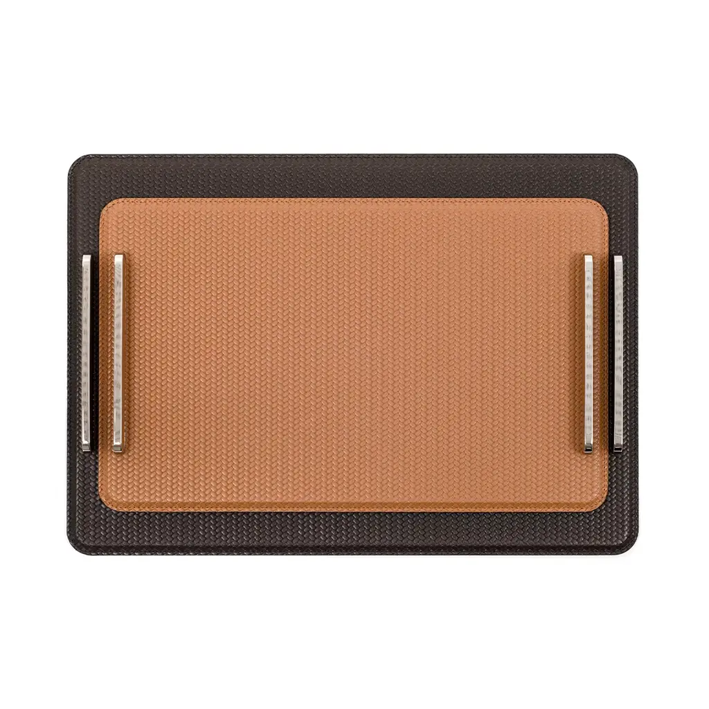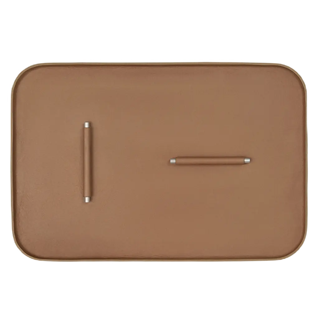This superb tray makes for a precious solution to enhance compositions of permanently displayed collectibles or elegantly serve drinks in refined modern contexts. Covered in prized, textured brown leather for an exclusive luxe feel, it is marked by a rectangular aluminum frame with rounded corners as the flat elements serving as sculptural handles with chromed profiles.