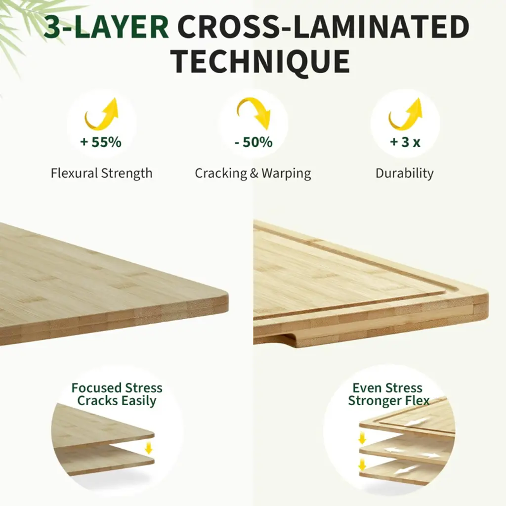 extra-large 24"x18" bamboo cutting board provides a spacious surface perfect for all your kitchen tasks¡ªfrom chopping meat and slicing vegetables to prepping for large family meals or gatherings Crafted from durable, knife-friendly natural bamboo, it resists cracking and warping while being gentle on blades to keep your knives sharper longer The built-in juice groove around the edge efficiently catches liquids to prevent spills and keep countertops clean Integrated side handles offer easy carrying and double the board as a stylish serving tray for cheeses, breads, and appetizers Easy to clean and maintain with simple washing and occasional oiling, this versatile bamboo board will remain beautiful and functional for years Dimensions: Length: 24 inches Width: 18 inches Thickness: Approximately 0.75 to 1 inch Material: Natural durable bamboo Features: Built-in juice groove, integrated side handles What You Get: 1 Extra-large bamboo cutting board with juice groove and handles After-Sales Service: We provide clear care instructions and responsive customer support to help keep your cutting board in excellent condition over time