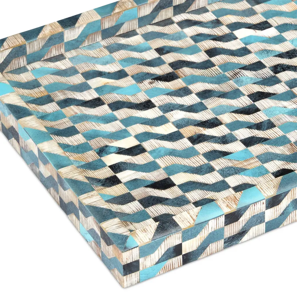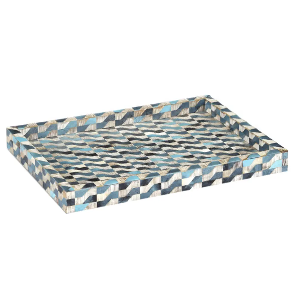 The Ezra Tray is a decorative tray made of alternating colors of bone and chiseled horn. The wavy pattern is created when blue, brown, and ivory colored bone and horn are hand-applied to the surface, which makes the blue and brown tray an artisanal accessory that packs a textural punch. Place this lovely decorative accessory on a kitchen island or a buffet and it will be a dynamic accent whether or not it holds any meal-specific elements. Ships In 7-10 Business Days This image is for illustrative purposes only. The colors shown are accurate within the constraints of lighting, photography, and the color accuracy of your screen.
