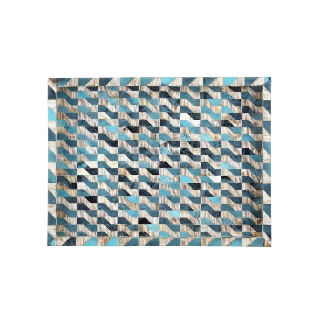 The Ezra Tray is a decorative tray made of alternating colors of bone and chiseled horn. The wavy pattern is created when blue, brown, and ivory colored bone and horn are hand-applied to the surface, which makes the blue and brown tray an artisanal accessory that packs a textural punch. Place this lovely decorative accessory on a kitchen island or a buffet and it will be a dynamic accent whether or not it holds any meal-specific elements. Ships In 7-10 Business Days This image is for illustrative purposes only. The colors shown are accurate within the constraints of lighting, photography, and the color accuracy of your screen.