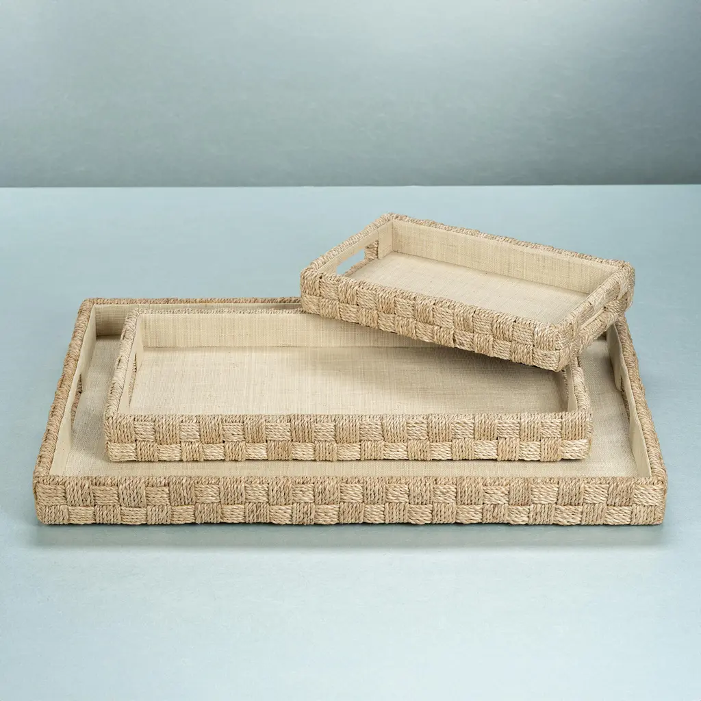 Abaca rope rectangular serving tray features cut out handles design with the lattice design and a fabric liner for a neat and modish look. Color: Natural Materials: Abaca Rope/Recycled Pulpboard/Paper/MDF Natural finish Handwoven natural abaca rope accented with cut out handles Black fabric bottom to protect your furniture and surfaces from scratches Blends well in coastal aesthetics For indoor use only Care Instructions: Wipe with dry cloth
