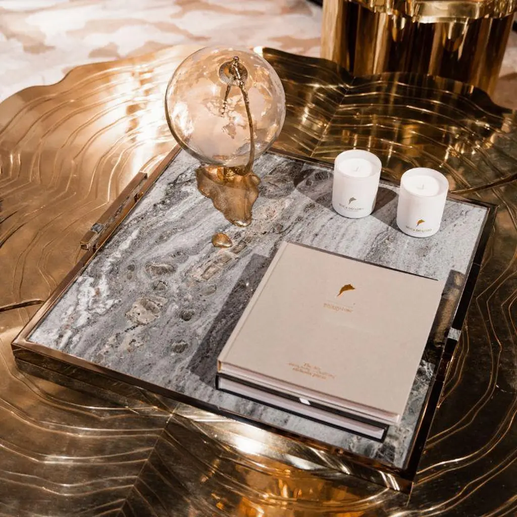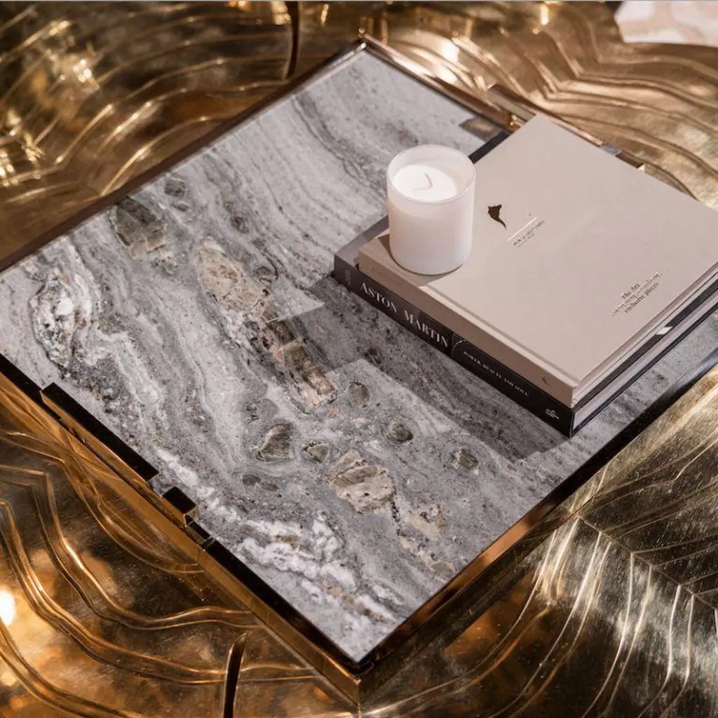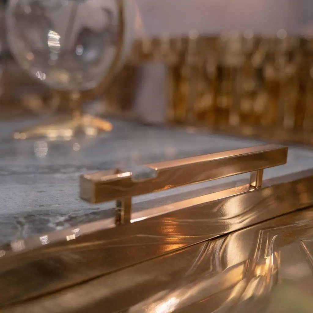 The Fahari Large Tray is a true statement piece, designed to elevate any ambiance with its luxurious combination of materials and refined craftsmanship. Featuring a stunning gold-plated finish, this tray is anchored by a unique marble base, carefully selected for its natural veining and organic elegance. Adding to its distinctive character, small marble stones are seamlessly integrated into the handles, creating a harmonious and sophisticated visual balance.Perfect for displaying decorative objects, serving drinks, or presenting appetizers to guests, the Fahari Tray blends functionality with sculptural beauty. Whether positioned on a coffee table, dining surface, or as a decorative centerpiece, its timeless design brings a touch of understated opulence to any setting. With its versatile appeal, Fahari transforms everyday moments into refined experiences, embodying the essence of luxury living.