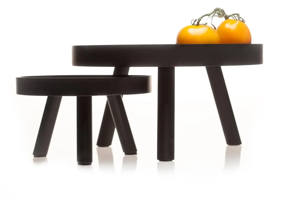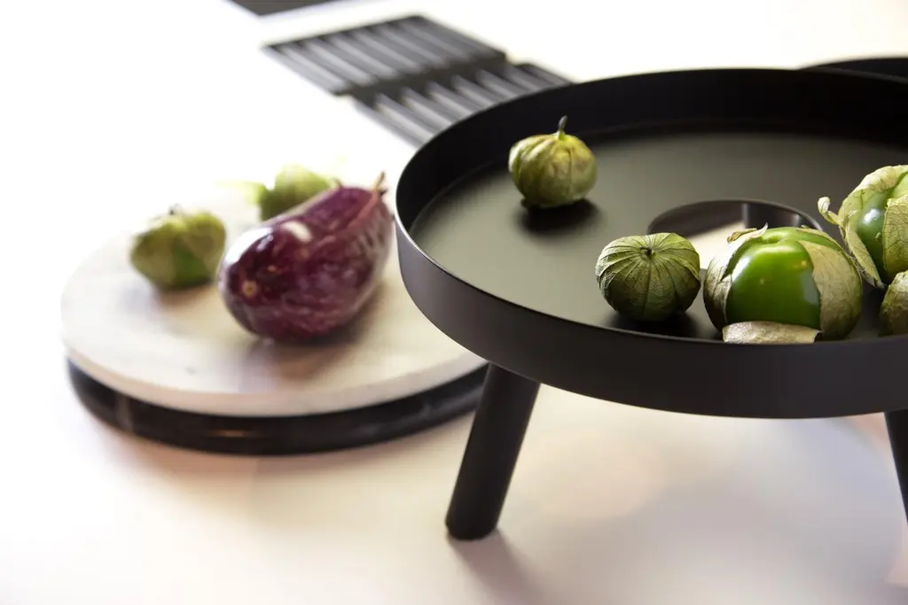 Lift, too small sizeSimple. Elegant. Minimalist. The abstract contemporary black small serving tray titled Lift, Too will redefine the landscape of your table setting. Inspired by the Pantheon in Rome with its powerful oculus and strong minimalist domed ceiling, the Life can be used for displaying fruit, serving cocktails or to create a centerpiece with candles ablaze. This decorative sculptural tray, finished in copper, brings a new dimension to your dining experience or perfect as a sculptural piece as home decor in a master bath or living room. Material: Black powder coated steel Size: Lift, too (small): H 10 cm (4 in) x ø 20 cm (8 in)Design: Felicia Ferrone, 2012Handcrafted in Chicago.