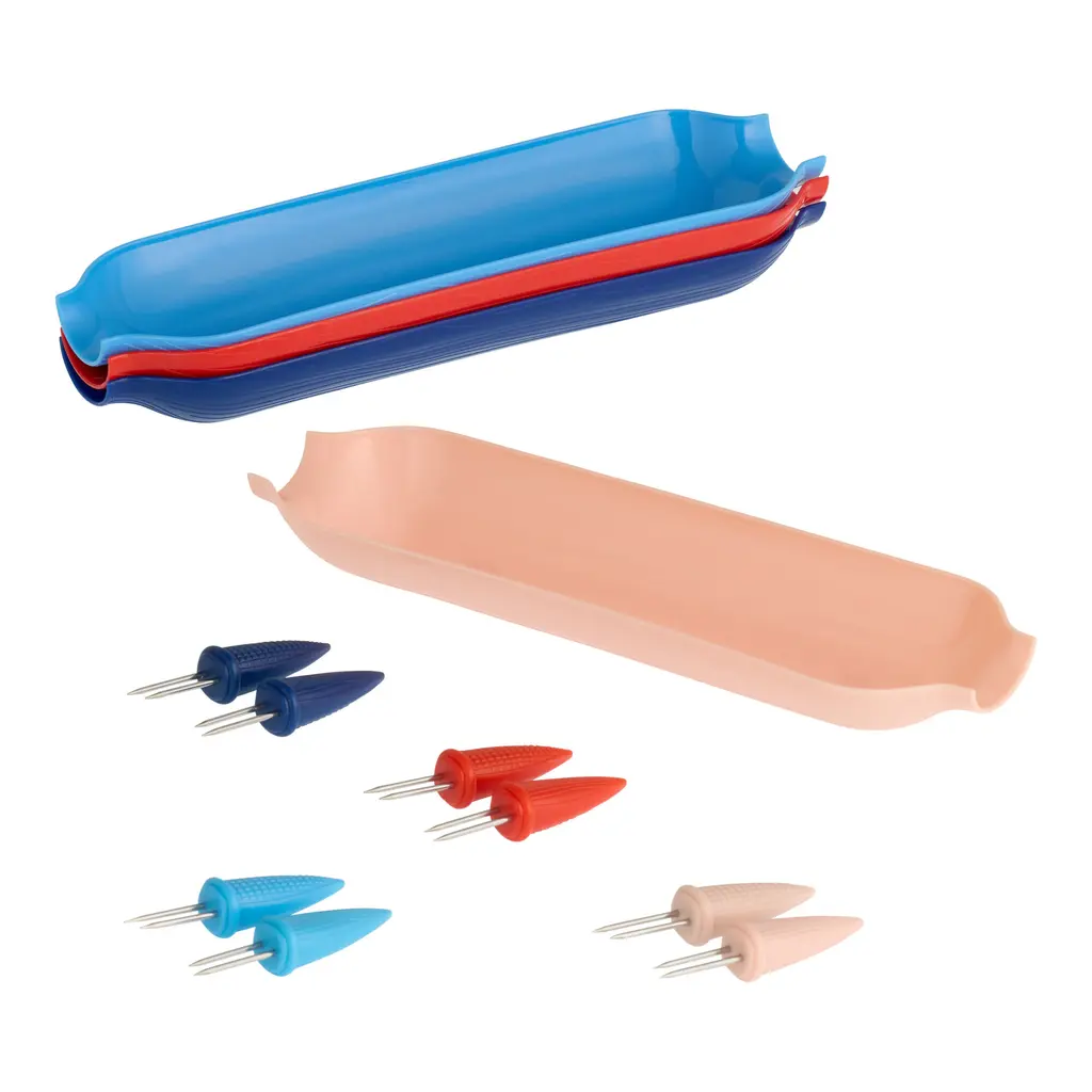 These fun figural corn holders with matching serving trays are durable and lightweight for outdoor entertaining in festive red, pink and blue colors. Featuring stainless-steel prongs, the four sets of holders create colorful, safe and mess-free grips for hot grilled corn cobs. If you fill the serving trays with butter, cotija cheese, spices or other favorites your guests can roll their freshly pronged corn to distribute the toppings evenly.