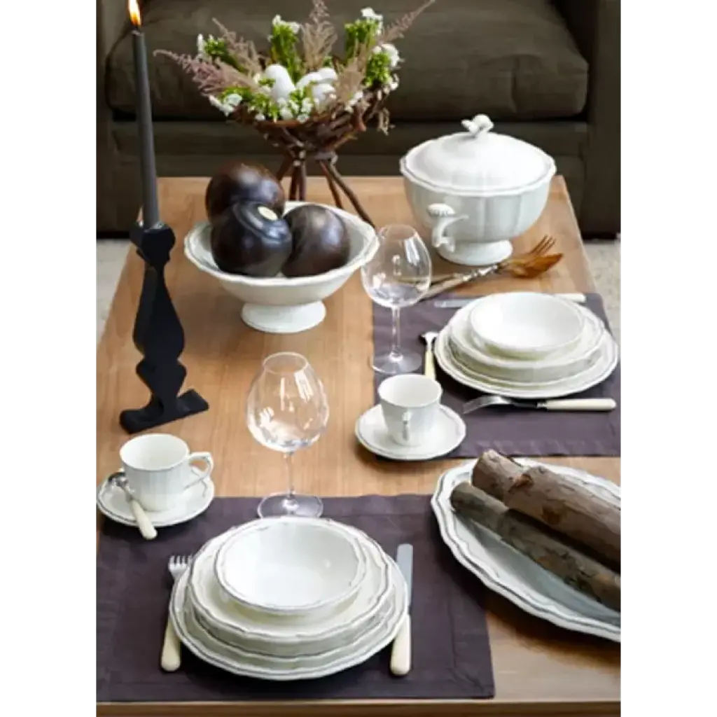 Gien's Filets Verts service is a timeless classic characterized by a shell border and handpainted lines. Faience earthenware made in France by Gien. Four-piece place setting includes dinner plate, dessert plate, bowl, and mug. Five-piece place setting includes dinner plate, dessert plate, canape plate, US tea cup, and saucer. Located near the Loire Valley castles, the Faïencerie de Gien has been synonymous with prestigious faience tableware and decorative objects since its founding in 1821. Gien pieces are renowned for their warm white clays decorated with traditional motifs reminiscent of the French countryside.